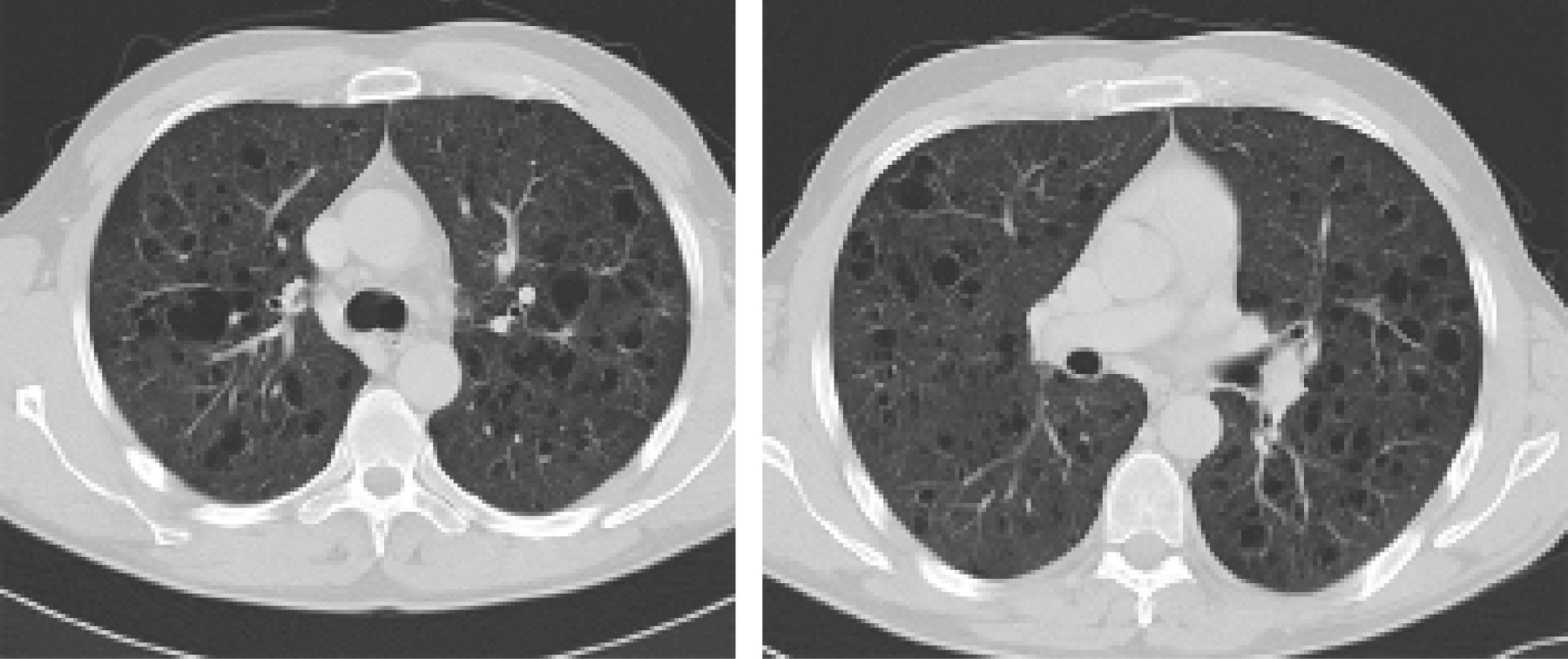 La tomografía computarizada de alta resolución (TACAR) ha facilitado y proporcionado una mejor valoración del parénquima pulmonar. El patrón radiológico principal es la existencia de nódulos centrolobulillares de predominancia en lóbulos superiores y de tamaño inferior a 1 centímetro. La progresión de las lesiones quísticas en la TC se correlaciona con un mayor deterioro funcional pulmonar.6