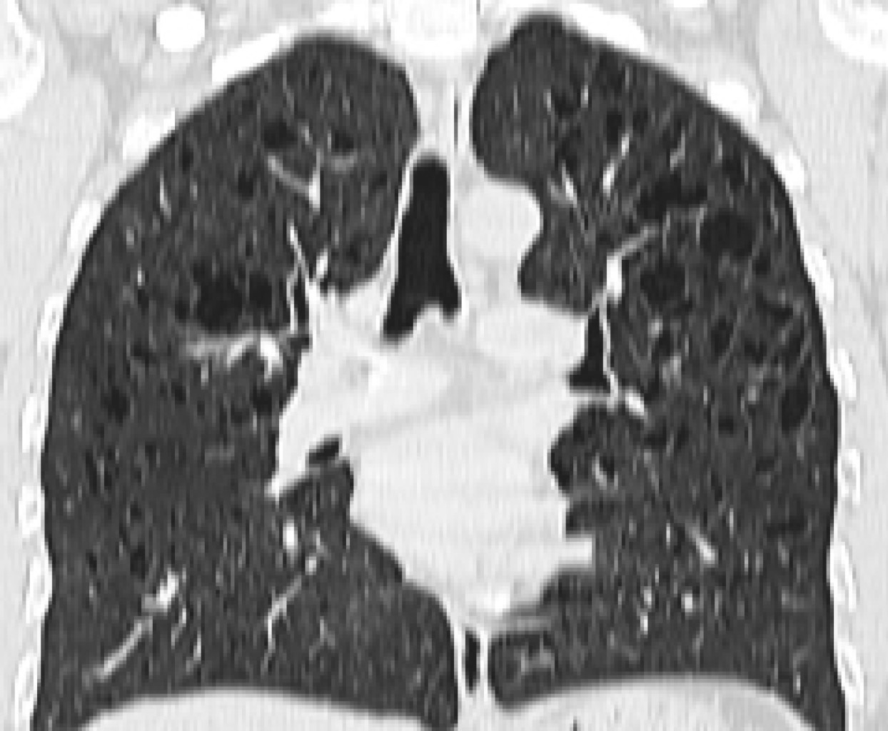 Se decidió realizar una tomografía computarizada (TC) para la valoración de otras posibles lesiones asociadas. El estudio puso de manifiesto de manera incidental la existencia de numerosas estructuras quísticas de paredes mal definidas con clara predominancia en ambos lóbulos superiores, asociando pequeños nódulos de distribución centrolobulillar. Los hallazgos radiológicos son sugestivos de enfermedad de histiocitosis de células de Langerhans pulmonar (Figuras 1 y 2).
