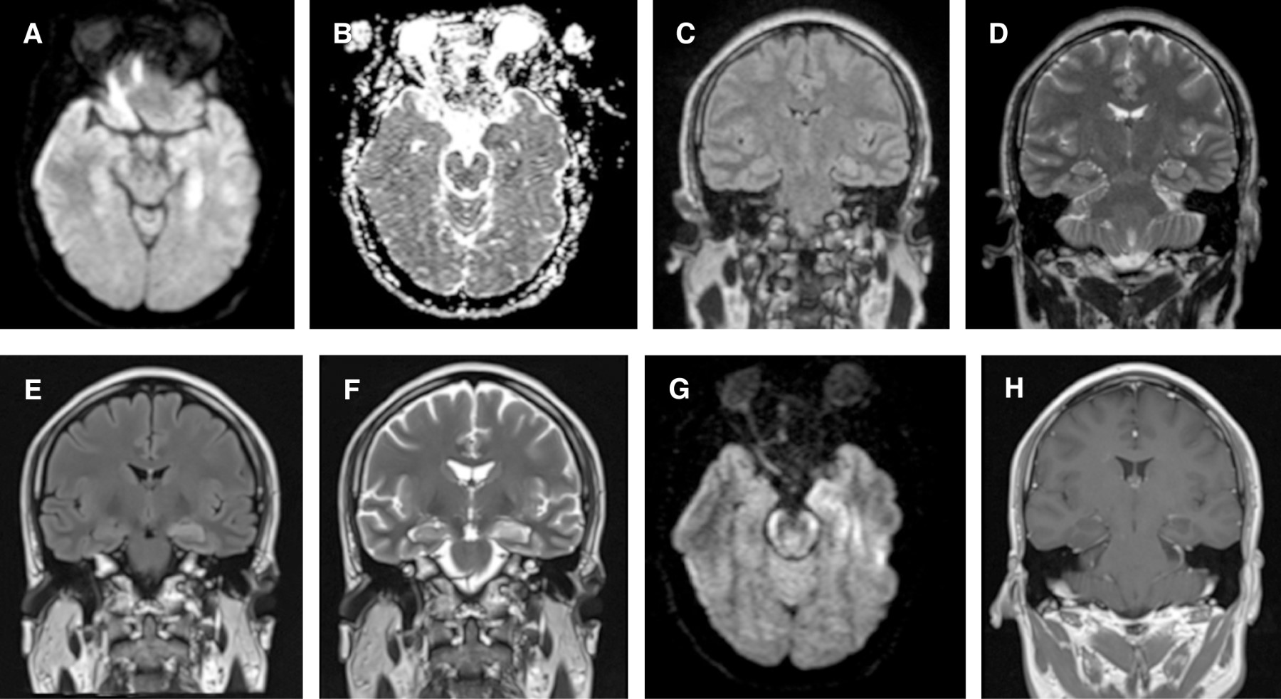 Debido al desarrollo de IA y de movimientos anormales se consideró la posibilidad de una encefalitis autoinmune, por lo que se determinaron anticuerpos antirreceptor de NMDA, anticuerpos intraneuronales (anti-Hu, anti-Yo, anti-Ri, antiamfifisina, anti-CRMP5) y bandas oligoclonales en LCR, los cuales fueron negativos. No se exploraron otros anticuerpos contra antígenos de superficie y proteínas sinápticas (antirreceptor AMPA, antirreceptor GABAB, antirreceptor LGI1, antirreceptor CASPR-2). El estudio microbiológico del LCR fue negativo para bacterias, hongos, micobacterias y para los virus herpes tipo 1 (HSV 1), herpes tipo 2 (HSV 2), varicela zóster (VZV), citomegalovirus, Epstein-Barr virus, Coxsackie A, Coxsackie B, Echovirus y virus West Nile (VWN). La serología para VIH y el VDRL sérico fueron negativos. Otros estudios para investigar enfermedades sistémicas fueron negativos (perfil tiroideo, anticuerpos antinucleares, anticardiolipinas, marcadores tumorales). La punción lumbar de control, realizada el sexto día de tratamiento antimicrobiano, mostró disminución de la pleocitosis (células 50, mononucleares 100%, proteínas 22.4 mg/dL, glucosa 66 mg/dL). La RM cerebral de control, con dos semanas de diferencia de la primera, demostró persistencia de la hiperintensidad en cuerpo y cola del hipocampo izquierdo en T2/FLAIR y de la restricción a la difusión en la misma zona, pero sin reforzamiento tras la administración de gadolinio (Figura 1E-H).