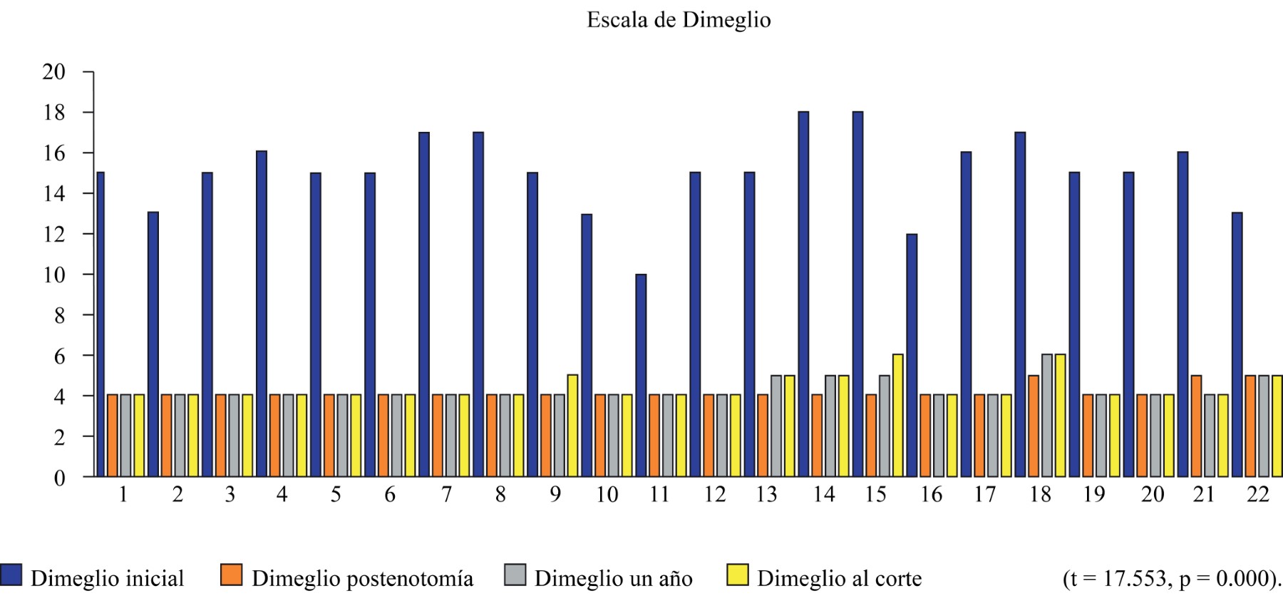 Se evaluaron a los pacientes con la escala de Dimeglio obteniendo medias: inicial 15.14 (mínima 10, máxima 18), posterior a la tenotomía 4 (mínima 4, máxima 5), al primer año de evaluación 4.2 (mínima 4, máxima 6) y al final del estudio 4.3 (mínima 4, máxima 6). Las diferencias de estas evaluaciones por cada paciente se muestran en la Figura 1.