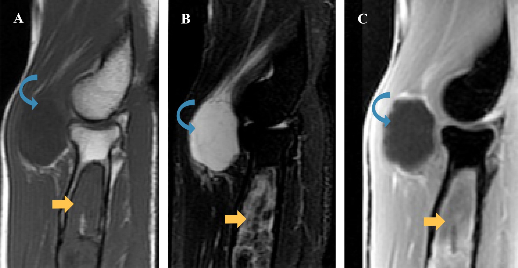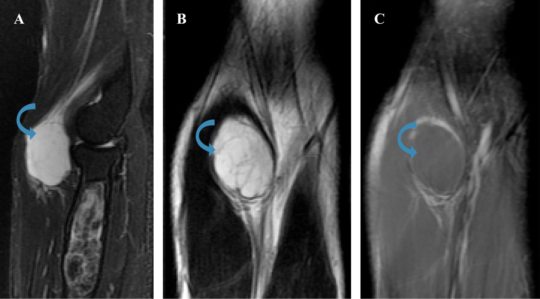 En el plano sagital (flecha curveada) se identifica lesión ovoidea, bien delimitada, localizada en los planos musculares de la región anterior del codo, homogénea hiperintensa en STIR. Se observa otra lesión en la región metafisiodiafisaria proximal del radio, la cual es de localización central, zona de transición estrecha con bordes esclerosos, de contenido heterogéneo y predominantemente hiperintensa en STIR (a). En el plano coronal, se observa la lesión de tejidos blandos, la cual es predominantemente hiperintensa con algunas hipointensidades irregulares centrales en T2 (b) y que no presenta realce tras la administración de medio de contraste en la secuencia T1 con saturación grasa (c) (Figura 2).