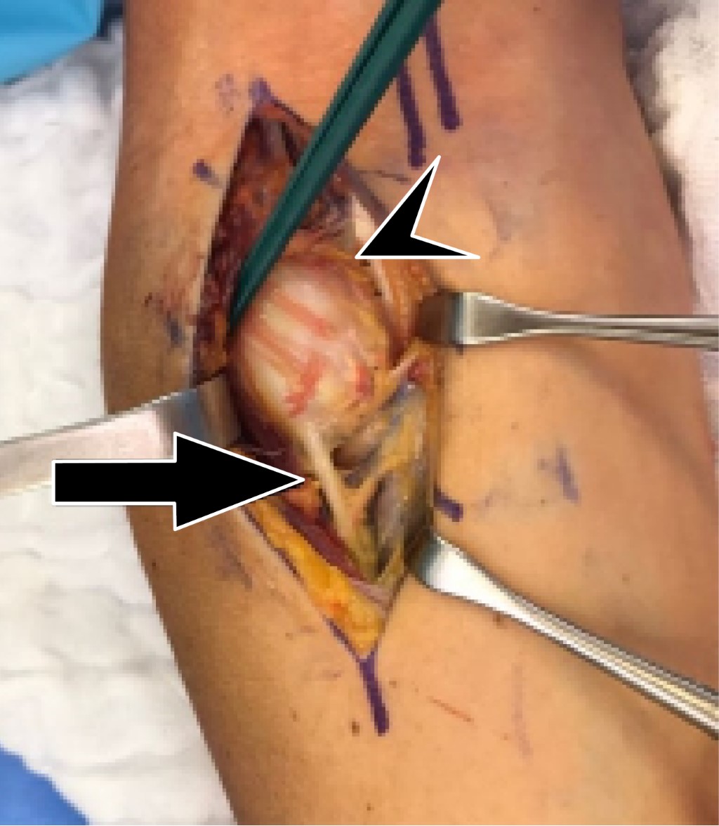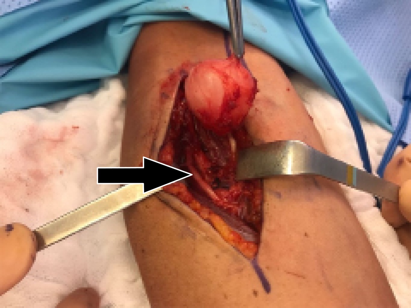 Durante la disección, se encontró adherida a la masa (flecha sólida) el nervio radial y una de sus ramas (punta de flecha). La masa se encontraba adherida firmemente, por lo que fue difícil su separación del mismo (Figura 3). Se logró disecar en su totalidad, respetando nervio radial y su rama (flecha sólida). Examinamos el lecho quirúrgico posterior a la escisión, no se encontró pedículo o evidencia de invasión local del tumor (Figura 4).