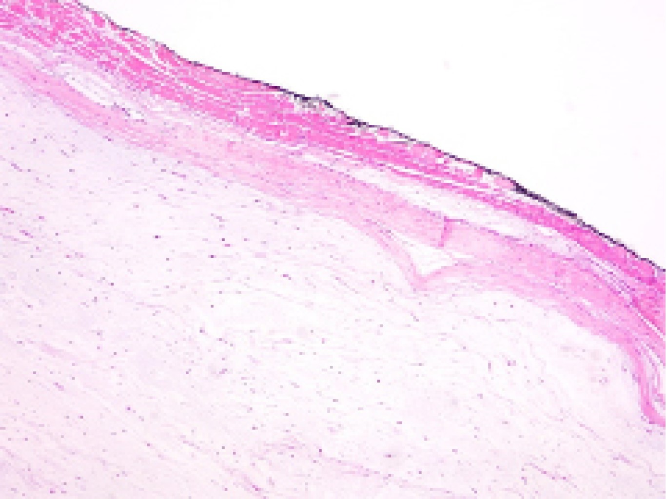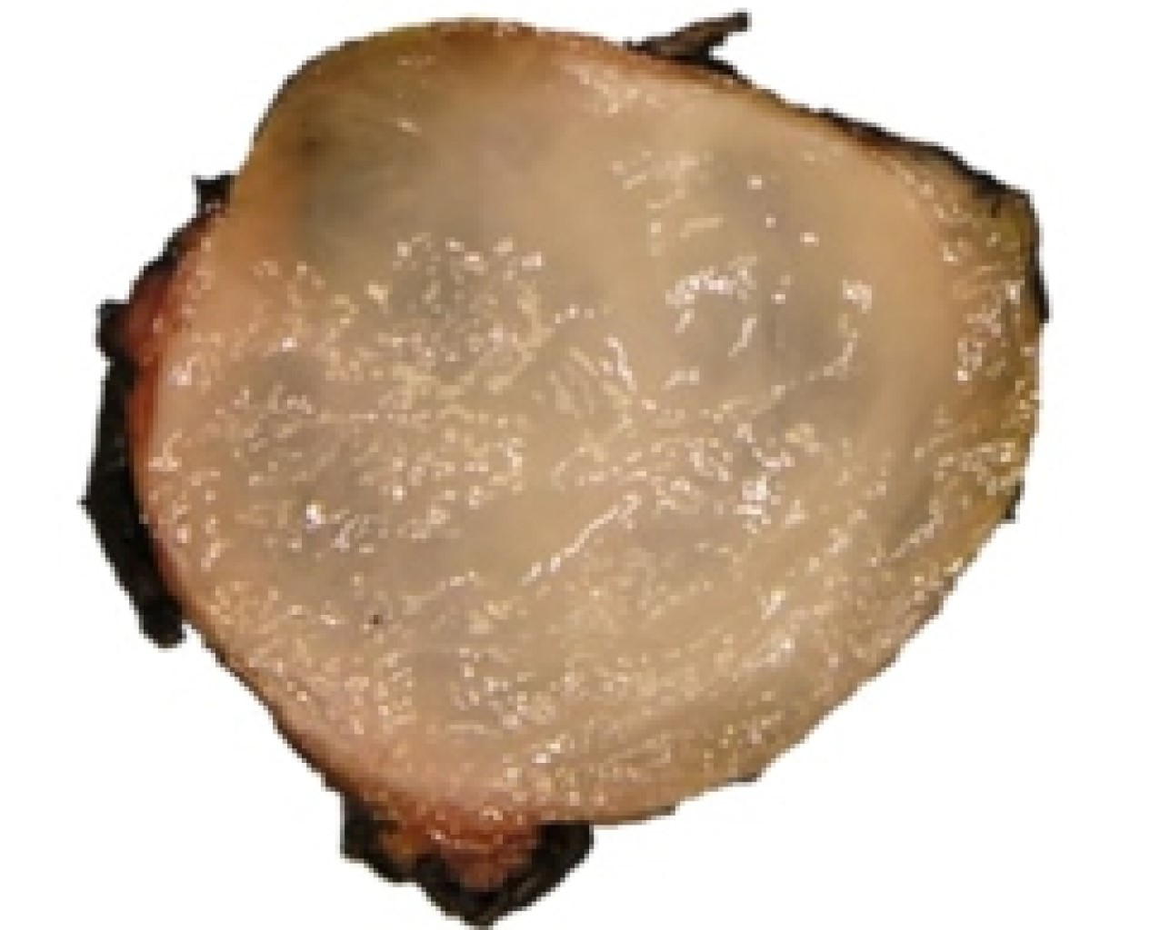 El reporte histopatológico mostró una masa uniforme, al corte muestra superficie blanquecina transparente de aspecto mixoide y de consistencia gelatinosa (Figura 5). En múltiples cortes teñidos con hematoxilina-eosina se reconoce neoplasia hipocelular, hipovascular, de aspecto homogéneo con abundante matriz mixoide. No se registra actividad mitósica ni necrosis tumoral. Se observa quistificación focal (Figura 6).