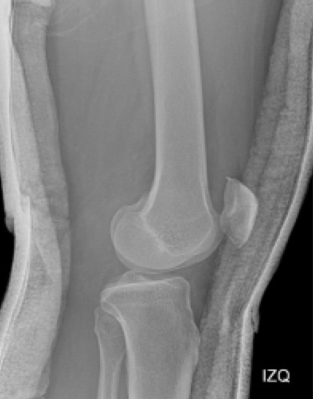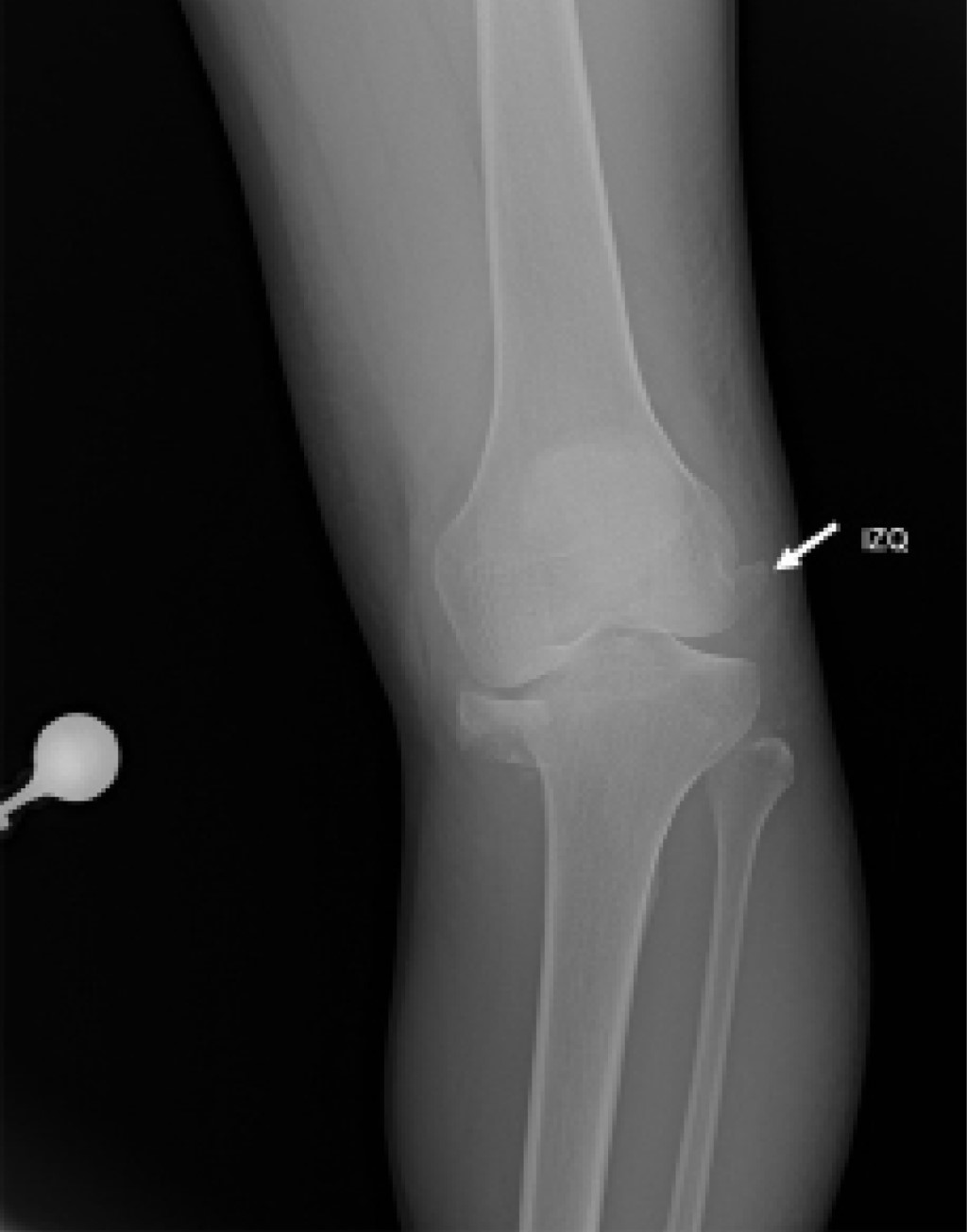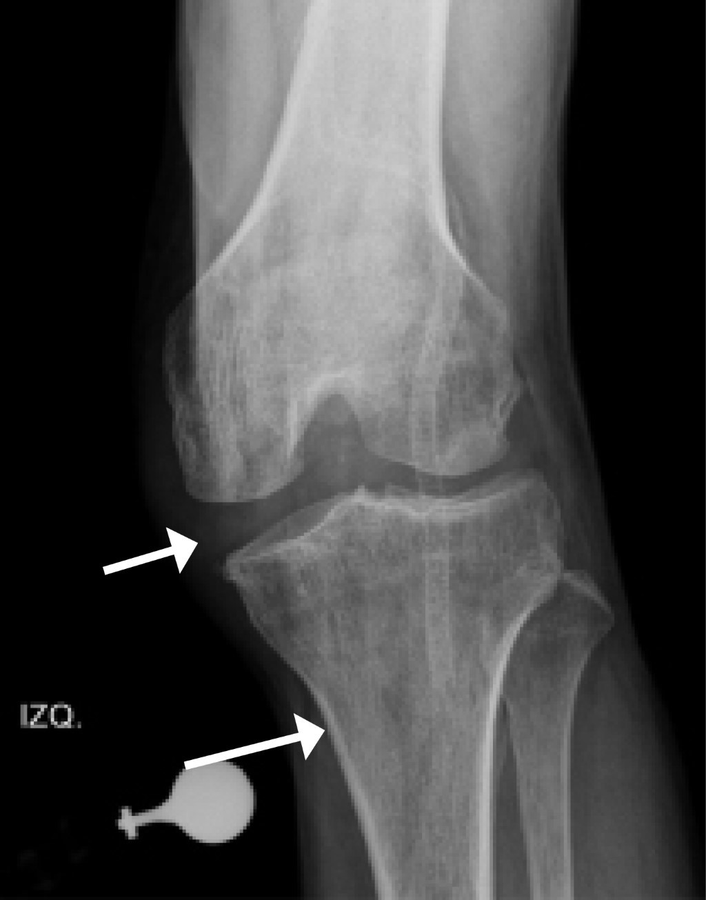 El segundo escenario es mucho más complejo de abordar, se presenta cuando el paciente ingresa al servicio de urgencias con la rodilla reducida, haciendo del diagnóstico de la luxación de rodilla un reto para el clínico, en el cual las radiografías iniciales tienen un papel valioso en la evidencia de hallazgos característicos que pueden sugerir el diagnóstico de luxación como la apertura de los espacios articulares tibiofemorales (Figura 4), fracturas del cóndilo femoral, fracturas de espinas tibiales anterior y posterior, signo del ligamento arcuato (Figura 5) o el signo de Segond (Figura 6).3