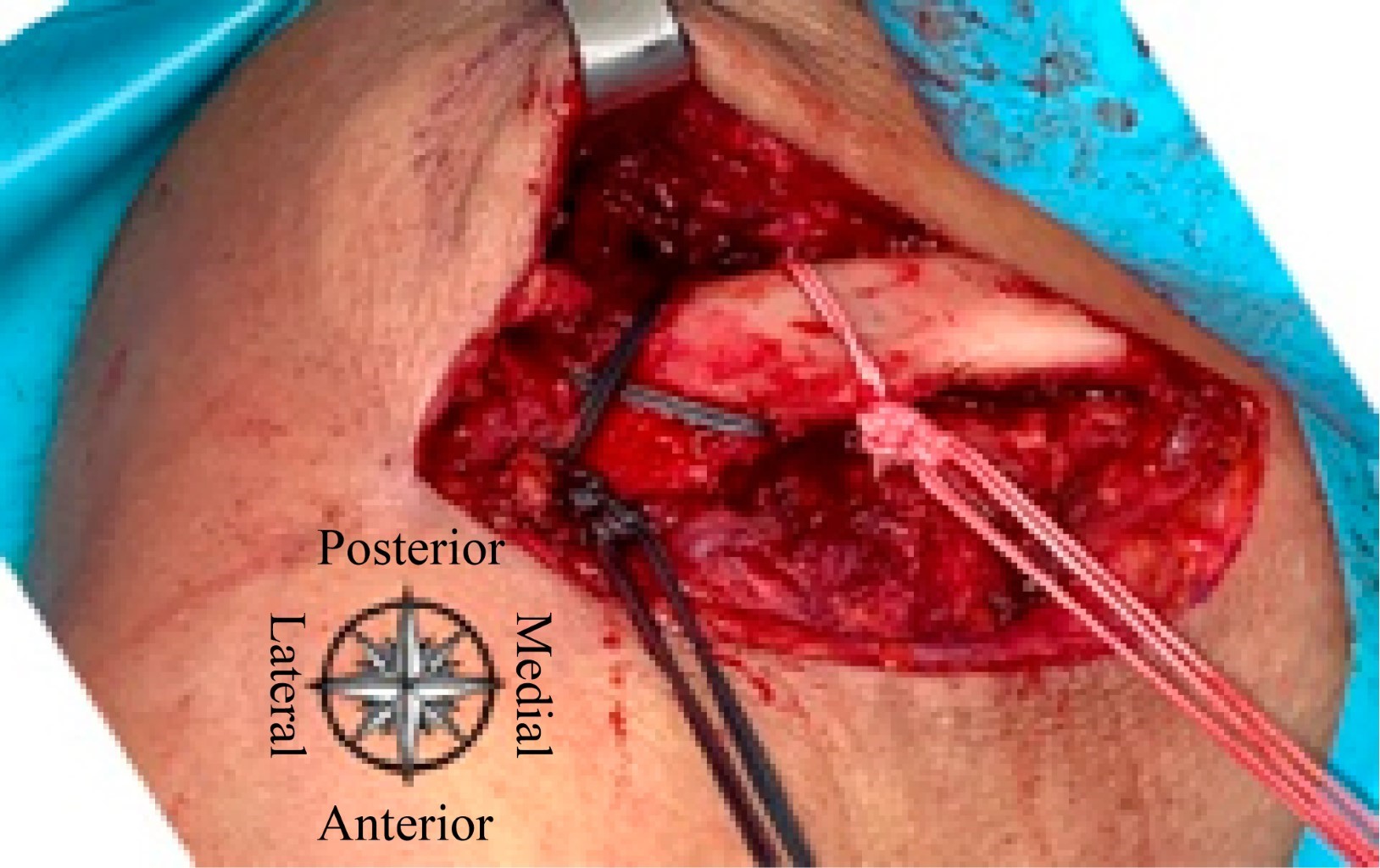 La cirugía se realizó bajo anestesia general y en la posición de silla de playa en todos los casos, aunque se podría realizar en posición supina según la preferencia del cirujano. Se realizó la incisión cutánea siguiendo el borde anterior de la clavícula desde la articulación acromioclavicular (AC) hasta el nivel de la apófisis coracoides. La fractura se expuso mediante disección superióstica dejando la cápsula de la articulación AC intacta. Tras disecar de forma roma los márgenes medial y lateral de la apófisis coracoides, se pasó una sutura de polietileno tereftalato (PET) de número 5 (Smartloop®, Fx Solutions, Viriat, Francia) en bucle por debajo de la base de la coracoides con ayuda de una pinza angulada tipo Satinsky. El extremo lateral de la sutura se pasó entonces alrededor del borde posterior de la clavícula y el extremo medial alrededor del borde anterior. La fractura se redujo elevando el hombro y aplicando presión hacia abajo en el fragmento medial de la clavícula, y las suturas se anudaron para mantener la reducción y controlar la estabilidad vertical.