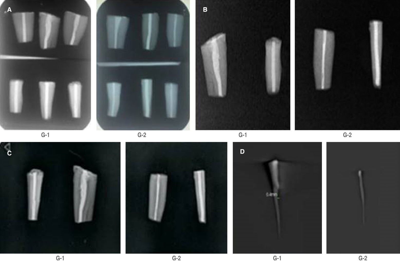 ®. Todas las muestras fueron de coronadas y estandarizadas a 10 mm, la instrumentación intrarradicular se realizó con Gates Glidden #3 y el protocolo de irrigación fue NaOCl 5.25% + ácido etilendiaminotetraacético (EDTA) 17% durante la instrumentación. Finalmente, los grupos fueron obturados con técnica de condensación lateral. Las muestras fueron observadas con las técnicas de rayos X, escáner, radiovisiógrafo y tomografía Cone Beam. Para la evaluación, se utilizó una escala de la densidad de obturación del conducto (0 = adecuada, 1 = aceptable, 2 = justa, 3 = inadecuada) empleada por un evaluador cegado. Un valor de la densidad de obturación del conducto fue asignado a cada muestra. El análisis estadístico empleado fue χ