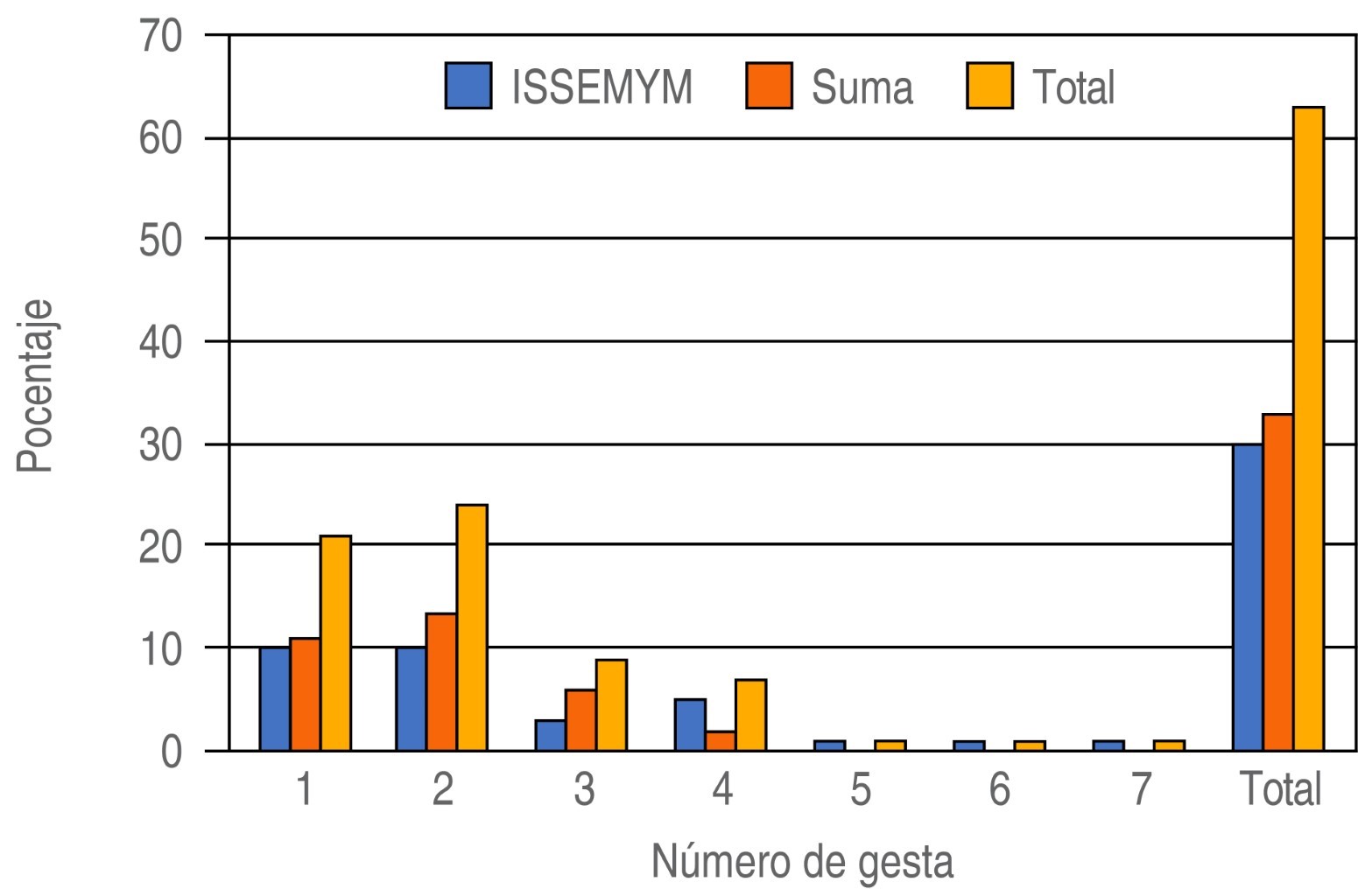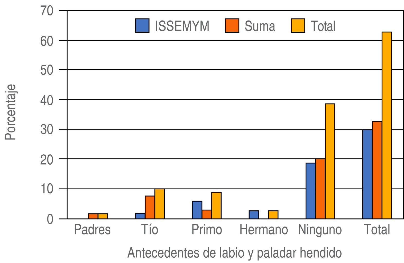 En esta investigación realizada en dos centros especializados en la atención de paciente con labio y paladar fisurado situados en el Estado de México y en la Ciudad de México, en un periodo de septiembre a noviembre de 2019, se obtuvieron los siguientes datos, el número de pacientes de sexo masculino fue de 65.1% y del sexo femenino fue de 34.9%, 39% de los pacientes masculinos presentó fisura bilateral, 41% unilateral izquierda y 19% unilateral derecha. Respecto al sexo femenino, 63% mostró fisura unilateral izquierda, 18.1% unilateral derecha y 18.1% fisura bilateral. En el número de gesta en la que se presentó la fisura fue mayor en los segundos hijos con 38.1%, la malformación congénita en la primera gesta fue de 33.3%, en la tercera gesta 14.3%, la cuarta gesta en 11.1% y en la posición sexta y séptima fue igual a 1.6% (Figura 1). De los pacientes, 63.3% no tuvo ningún antecedente heredofamiliar de la fisura y 36.7% sí presentó algún familiar con algún tipo de fisura labio-palatina (Figura 2).