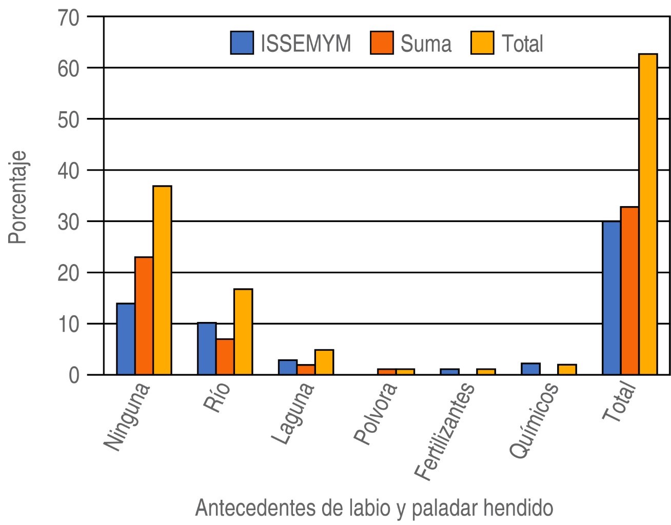 Se están realizando diferentes estudios que buscan una relación con algún tipo de contaminante como factor desencadenante de las malformaciones que han encontrado relaciones significativas. Se ha relacionado con altos niveles de contaminación ambiental, con una asociación real o aparente con la contaminación industrial desembocada en ríos, se han reportado casos en similitud con nuestro estudio de una exposición laboral de la madre con un ambiente tóxico como fábricas donde están en contacto con químicos, ciertos fertilizantes, pesticidas y plaguicidas. Se ha descrito 49.48% de incidencia de labio y paladar en población cercana a zonas de contaminación industrial en el Estado de México. En 2013 se reportó una relación importante con residuos sólidos y sólidos urbanos. Un estudio realizado en México de 2003 a 2009 evidenció una amplia relación con factores de contaminación y en este estudio el Estado de México siempre estuvo dentro de los primeros cinco lugares de incidencia.1,3,4,6,8,21,22 El presente estudio reveló que 60% de las madres vivía en condiciones ambientales de salud sin tener ningún tipo de relación con algún contaminante y sólo 27% que habitaba en zona rural reportó tener su vivienda cerca de algún río que pudiera tener o no una relación como medio de contaminación.