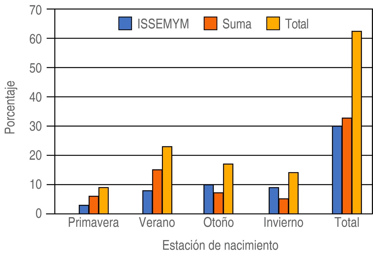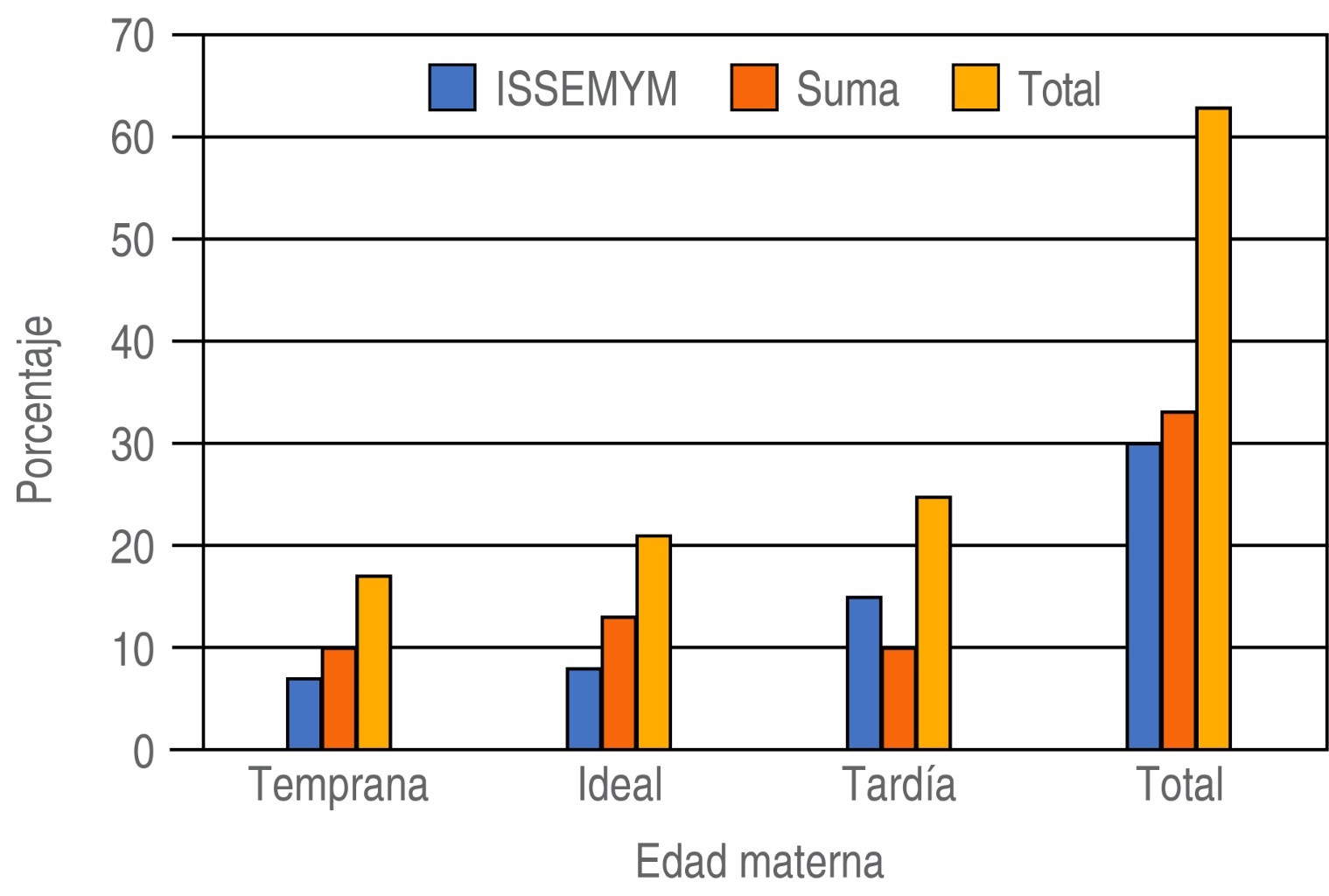 De las madres, 33.3% se encontraba en una edad ideal para el embarazo, 27% se embarazó a edades tempranas y 39.7% a una edad tardía (Figura 4). En verano se presentó el mayor número de niños nacidos con fisura (36.5%), siguió en frecuencia otoño (27%), invierno (22.2%) y primavera con 14.3% (Figura 5).