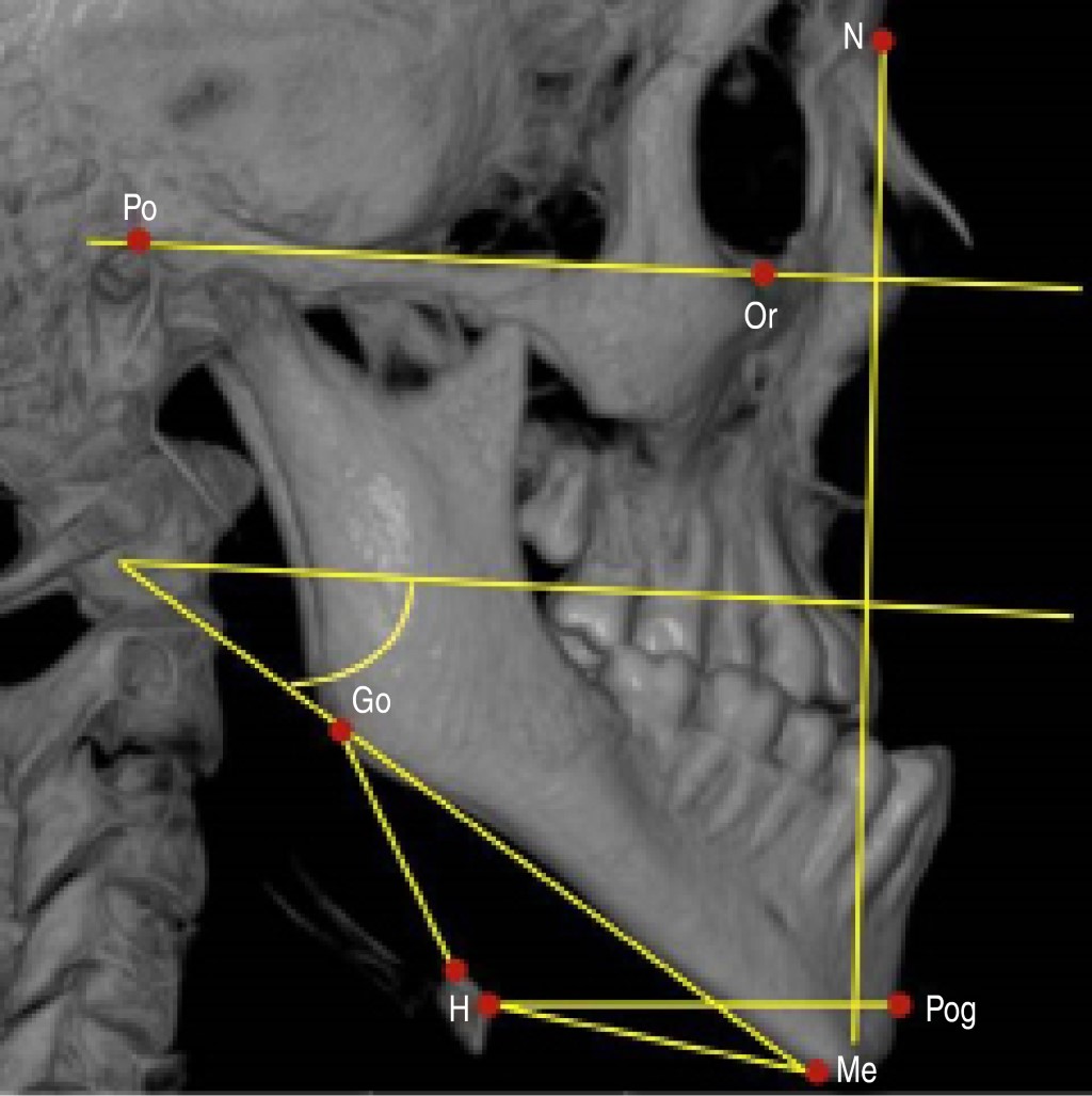 Se midió la angulación de la intersección de los puntos Po-Or y Go-Me (gonión: punto localizado en la parte más posterior e inferior del ángulo mandibular; Me: punto más inferior de la sínfisis mandibular) con parámetro de normalidad de 25o ± 4o.