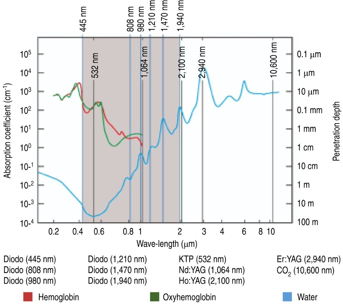 The most suitable wavelength for this type of treatment is 450 nm (blue), which has great affinity for hemoglobin and is at its absorption peak (Figure 1). With this, its action is more specific and thus provides less tissue damage in adjacent regions.