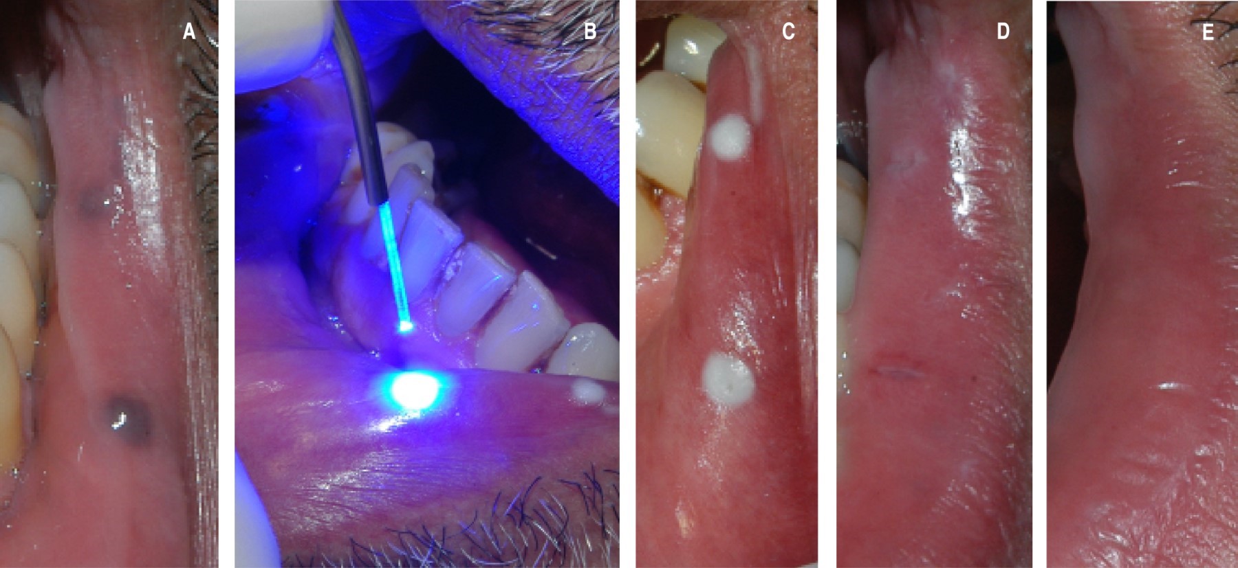After anesthesia the surgical technique of photocoagulation was performed with high power diode laser for the blue wavelength (Medlaser - DMC - São Carlos/SP - Brazil, 450 nm, 600 µm diameter fiber, 2W, pulsed mode, 20 us pulse) and infrared (Thera Laser Surgery - DMC - São Carlos/SP - Brazil, 980 nm, 600 µm fiber diameter, 2W, pulsed mode, 20 us pulse), being applied in a blur mode, without contact, maintaining a distance between 1 to 2 mm from the lesion and making continuous sweeping movements in a circular direction. Once it was verified the visual alteration of the lesion forming an ischemia, the treatment was finished. The average laser application time was 15 seconds. After the procedure the postoperative recommendation was only the use of topical triamcinolone acetonide ointment (Oncilon A - orabase - Aspen Pharma - Serra / ES - Brazil).