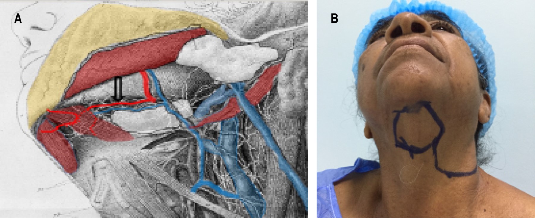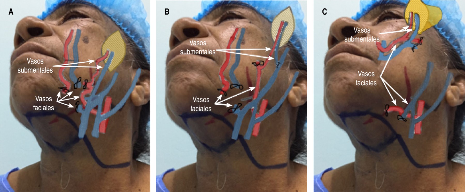 El colgajo se puede levantar con anestesia local o general. El paciente se coloca en decúbito supino con la cabeza y el cuello moderadamente extendido. La paleta cutánea llega a alcanzar hasta 10 cm por 16 cm, el pedículo alcanza hasta 5 cm y se incluyen el músculo platisma, una parte del milohioideo, así como el músculo digástrico anterior.8 La arteria facial pasa por el borde mandibular justo por el ángulo anteroinferior del masetero (Figura 1A).