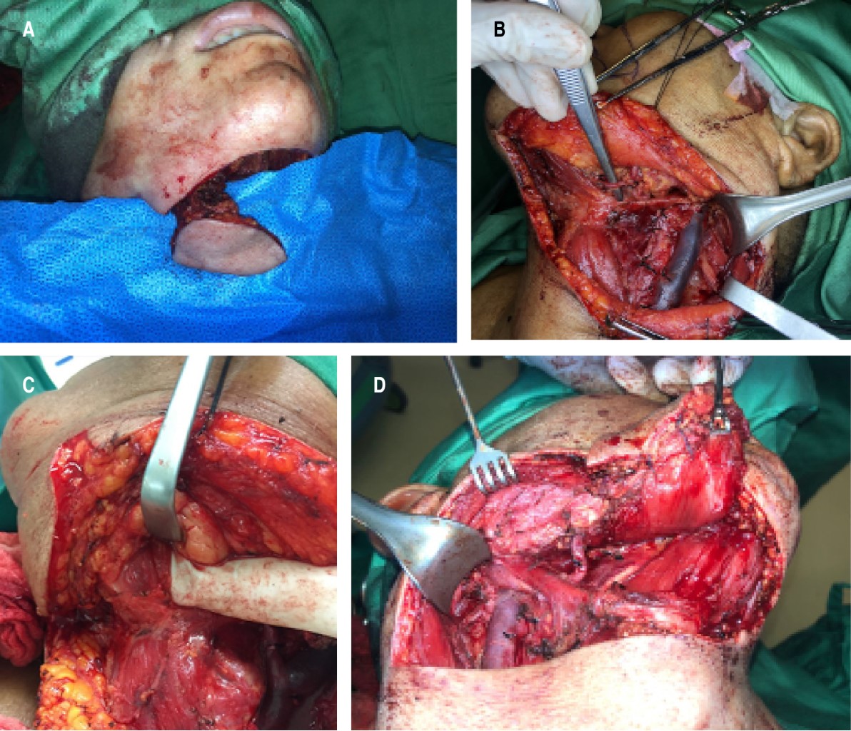 Se realizan incisiones en los márgenes del colgajo y se levanta el recorte, comenzando en el lado contralateral, levantando y disecando todos los tejidos encima de los músculos milohioideo y digástrico contralateral, y dirigiéndose hacia el pedículo, que podría estar completamente esqueletizado o no (Figura 2A-B). Esto produce un colgajo grande de piel, con un pedículo confiable y resistente que puede ser tunelizado a su sitio receptor.