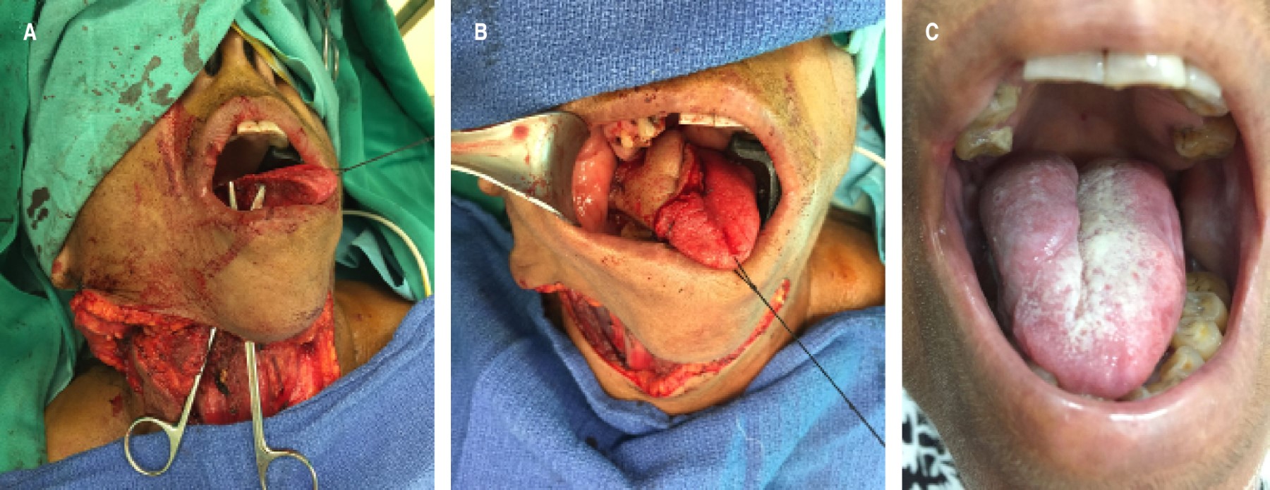 Caso 1: Defecto en lengua. Paciente femenino de 71 años de edad, presentando un carcinoma de células escamosas en el borde lateral de la lengua (T2 N0 M0). Ella se sometió a una disección supraomohioidea con glosectomía parcial y colgajo en isla submental para la reconstrucción. Este recorte ofreció una reparación que restauraba el volumen de la lengua mientras mantenía la misma libremente móvil, procurando facilitar el habla y la deglución, nótese en la imagen cómo hizo metaplasia el colgajo (Figura 4).