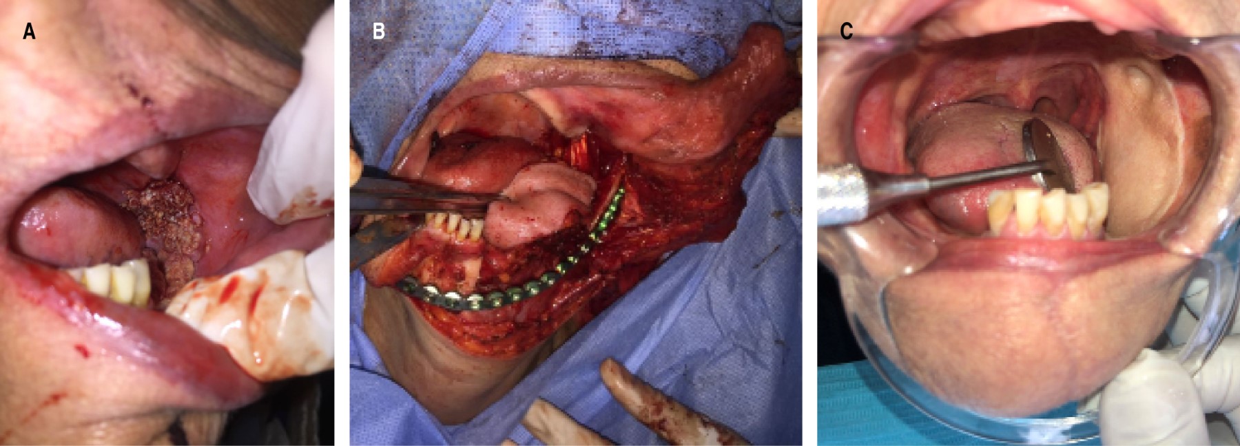 Caso 2: Defecto intraoral. Paciente femenina de 82 años de edad, con un carcinoma de células escamosas en el trígono retromolar y reborde alveolar inferior (T4 N0 M0). Ella se sometió a una amplia resección tumoral con mandibulectomía segmentaria y remodelación con colgajo en isla submental y placa puente de 2.7 mm de reconstrucción. Este colgajo ofreció una simple reparación de toda esa región y su porción alveolar, dando cobertura a la placa puente y a la región del trígono mandibular (Figura 5).