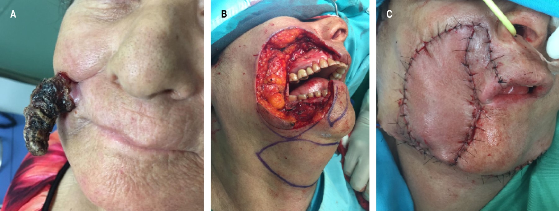 Caso 3: Defecto facial. Paciente femenina de 82 años de edad, con diagnóstico de carcinoma mucinoso submucosa en todo el carrillo derecho y con perforación cutánea en la región geniana. En el examen clínico, el tumor se palpaba muy próximo a la mucosa, extendiéndose de manera submucosa, sin linfoadenopatía. La lesión fue extirpada ampliamente en la región geniana (incluyendo la comisura labial, buscando márgenes de seguridad) y el defecto fue reparado usando un colgajo en isla submental y un colgajo de rotación tipo Estlander para la reconstrucción de la comisura labial. Sin incidentes postoperatorios, fue dada de alta al hogar en el quinto día (Figura 6).