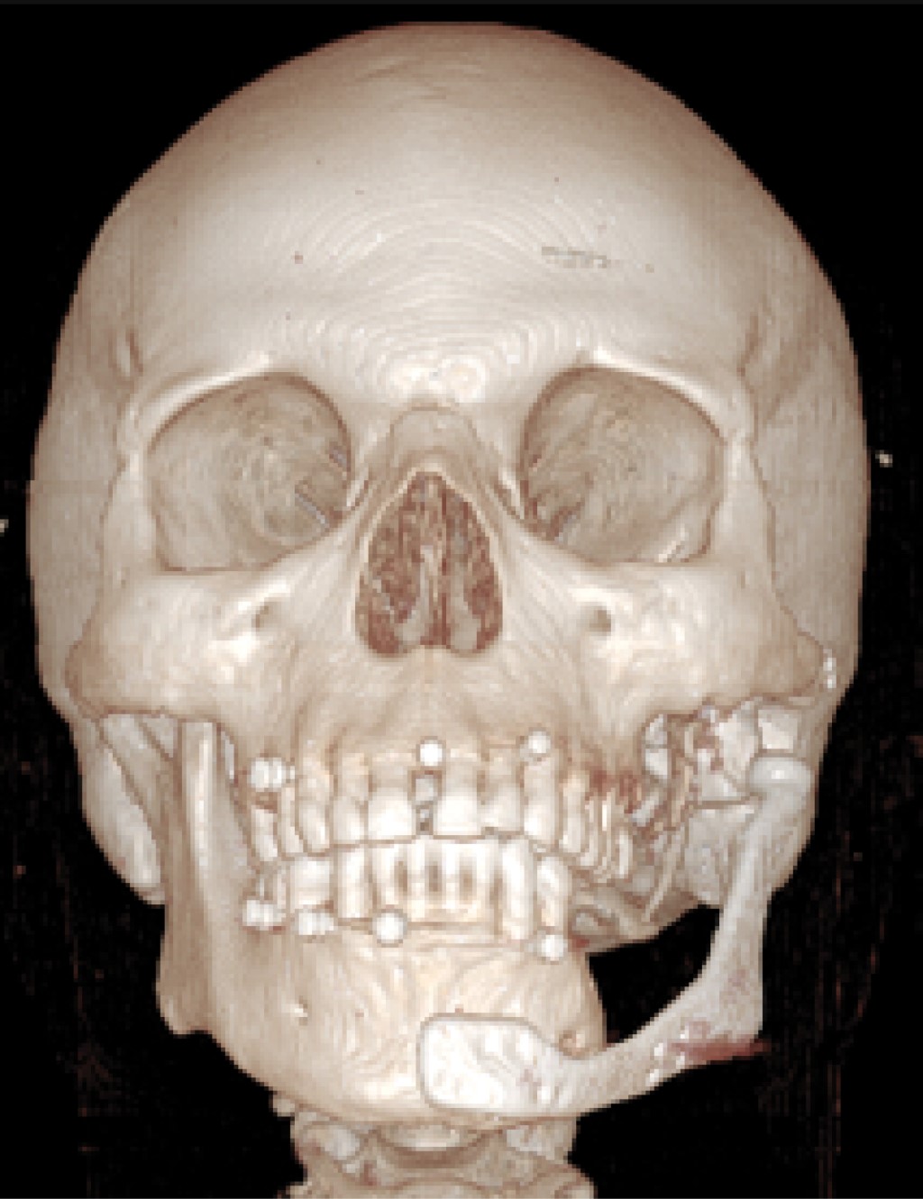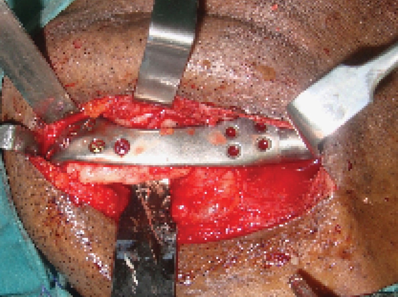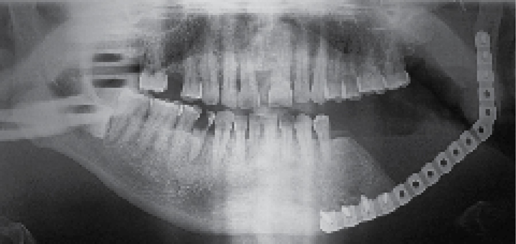 En enero de 2014 un paciente de 50 años de edad concurre al Servicio de Cirugía Maxilofacial del Hospital Zonal General de Agudos Manuel Belgrano presentando asimetría facial a causa de aumento de volumen en región geniana del lado izquierdo (Figura 1) con un estudio anatomopatológico con resultado de ameloblastoma multiquístico folicular en maxilar inferior. Como antecedente médico relevante el paciente padece diabetes tipo II. Se hicieron los estudios por imágenes de rutina (Figura 2) y en mayo de 2014, luego de firmar el consentimiento informado, se le realizó la resección segmentaria mandibular con un margen de seguridad de 1.5 cm, el cual permitió conservar el cóndilo mandibular, y se efectuó la reconstrucción inmediata con una placa de reconstrucción TMS 2.4 (WL, BIOMET) (Figura 3).