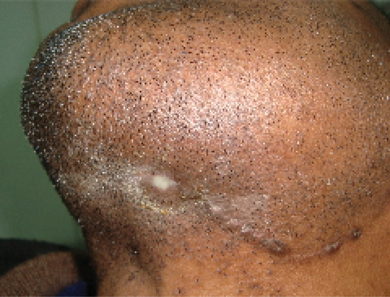 A los 30 días postoperatorios el paciente evolucionó con una fístula orocutánea con secreción purulenta (Figura 4). En conjunto con el servicio de infectología y luego de no haber una respuesta favorable al tratamiento no invasivo se decidió el retiro de la placa de osteosíntesis y cóndilo mandibular.