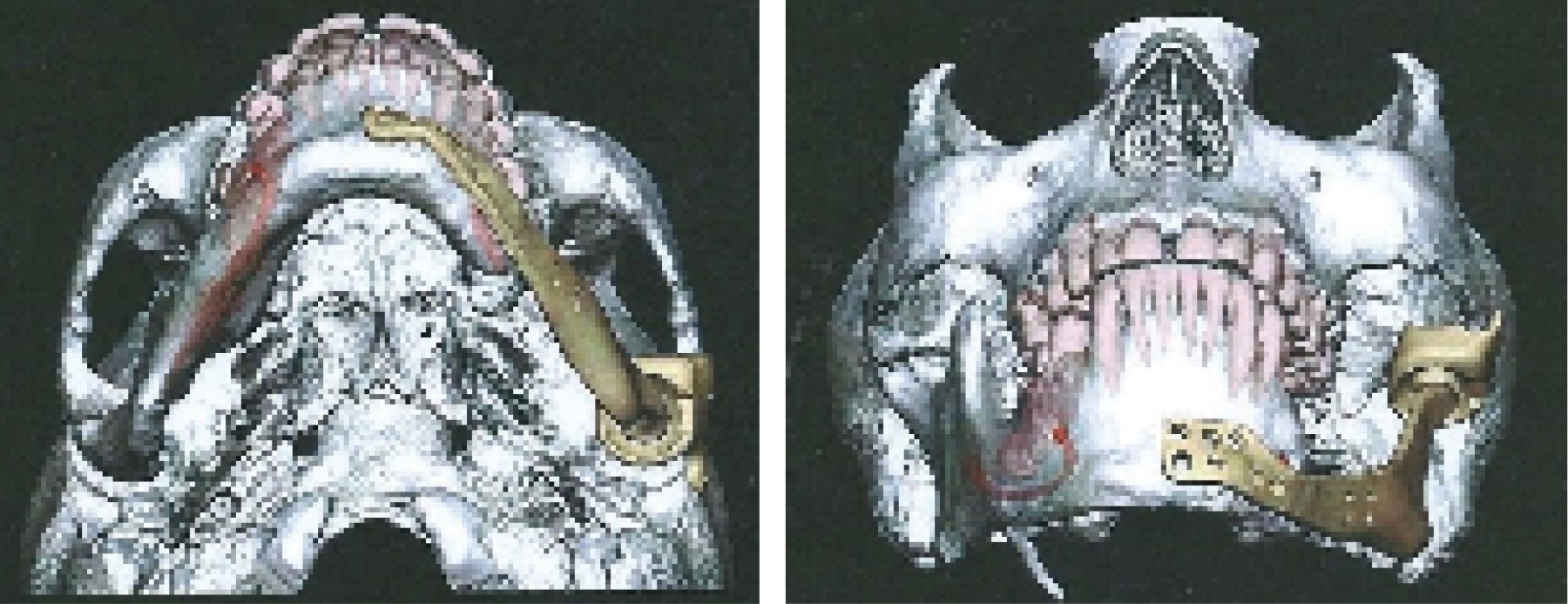 En agosto de 2015 se planificó la reconstrucción simultánea del componente mandibular y articular (Figura 5). A partir de este diseño se confeccionó una prótesis aloplástica personalizada Lorenz-Biomet (Biomet Microfixation, Jacksonville, FL, USA).