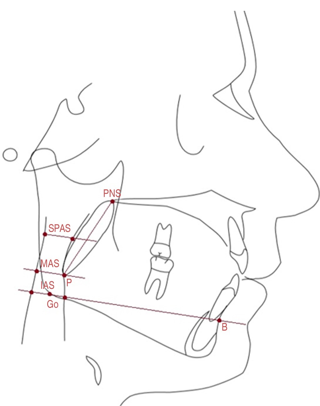 Se utilizó el software de trazado cefalométrico digital Dolphin Imaging 11.9 Premium® para el análisis cefalométrico y se les trazó el estudio cefalométrico de Quas/Airway, todos por el mismo operador, en los cuales se evaluó la vía aérea superior (línea SPAS), media (línea MAS) e inferior (línea IAS) de la faringe, antes y después del tratamiento (Figura 1).11