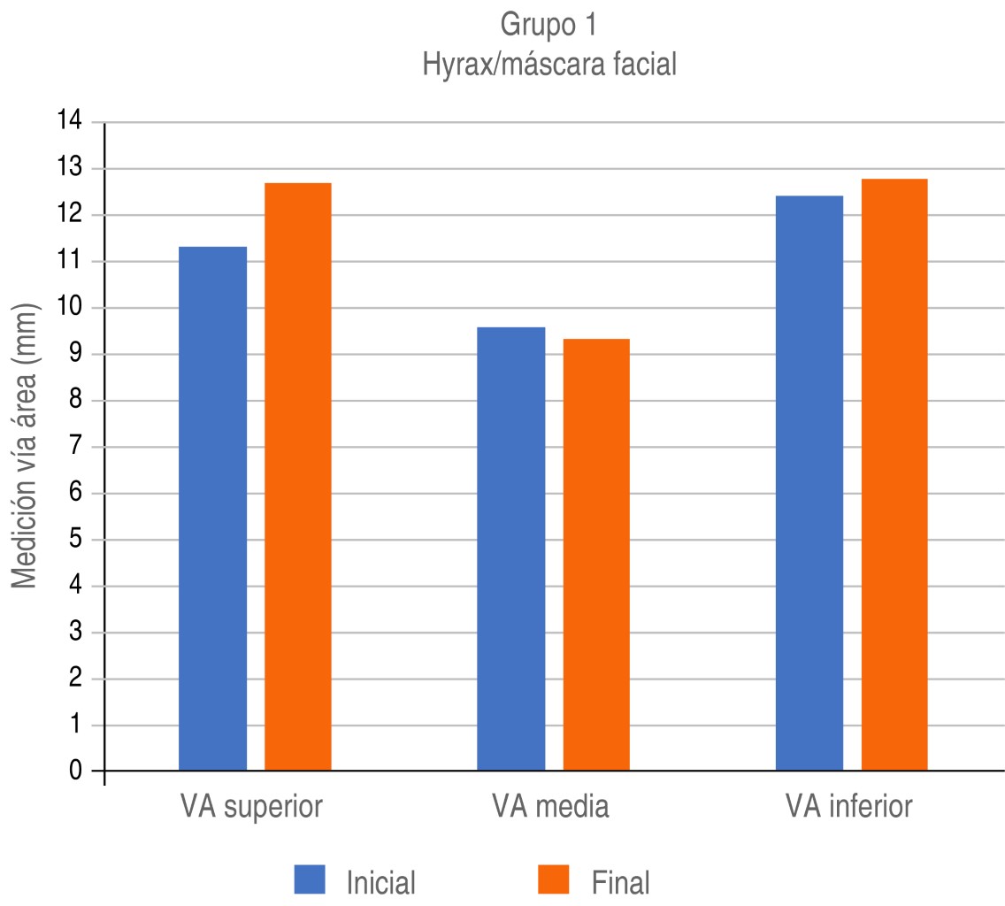 En el grupo 1 de los tratados con máscara facial y expansor tipo Hyrax se obtuvo como longitud inicial promedio de la vía aérea superior, media e inferior 11.28, 9.57 y 12.35 mm respectivamente, y en la medición final de la vía aérea superior, media e inferior se obtuvieron promedios de 12.7, 9.34 y 12.75 mm respectivamente. Aunque en este grupo de pacientes se observaron cambios en la medición inicial y final, no se encontraron diferencias estadísticamente significativas (p > 0.05) (Figura 2).