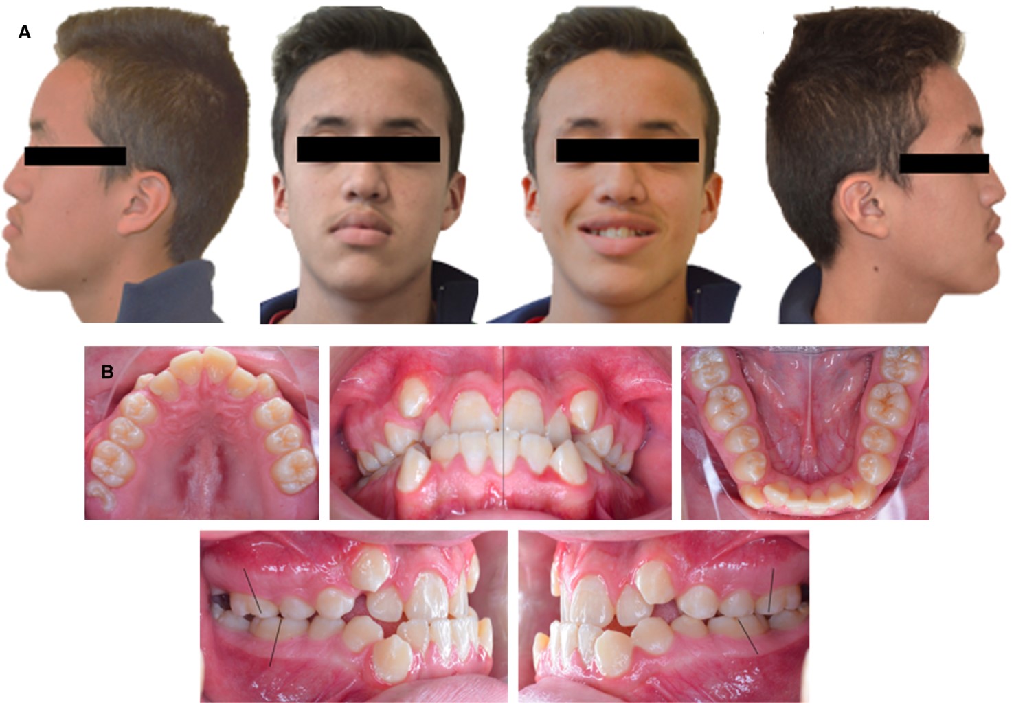 Análisis extraoralPresenta crecimiento y desarrollo anormal, con un biotipo braquifacial, mentón prominente, incompetencia labial, facies adenoidea, tercio medio facial deprimido, asimetría facial de lado derecho, líneas de sonrisa coincidentes, línea media dental superior e inferior desviadas a la derecha, perfil cóncavo, crecimiento hipodivergente, cara larga y ovalada, labios gruesos y prominentes (Figura 1A).