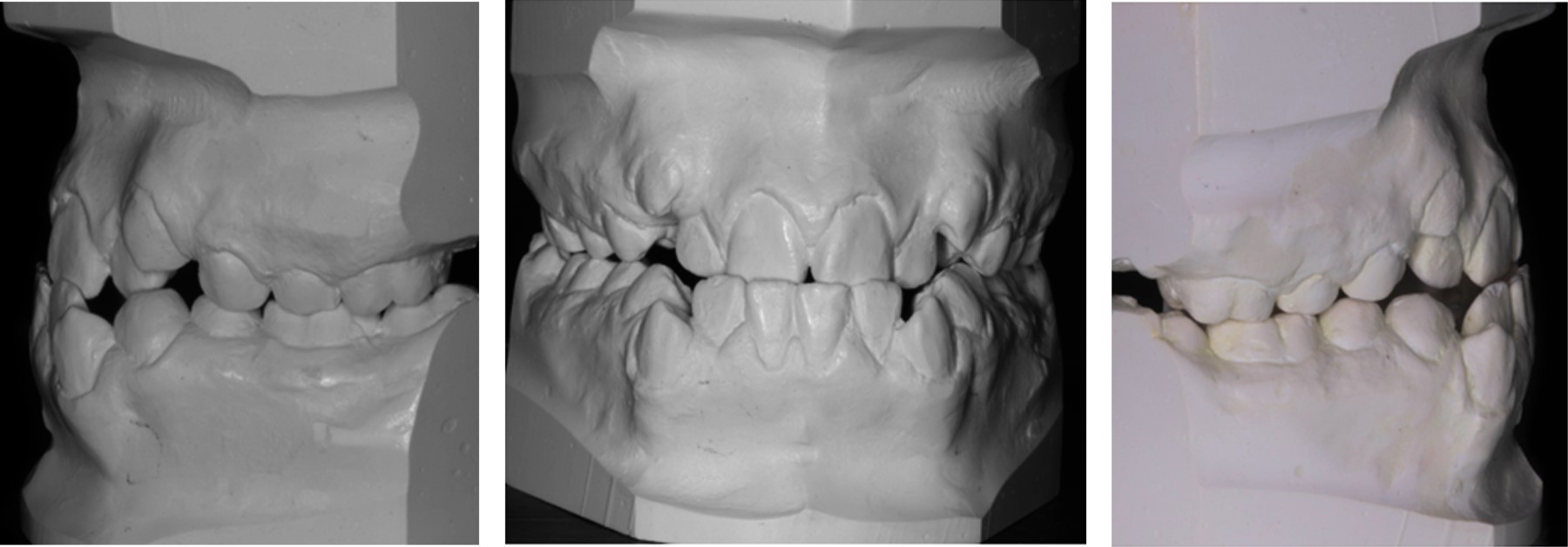 Diagnóstico: presenta una clase III esquelética por una hipoplasia del maxilar, con un biotipo braquicefálico, clase III molar, clase canina no establecida, sobremordida horizontal: -1 mm, sobremordida vertical: 1.5 mm, DLA: superior: -10.3 mm, inferior: -7 mm, línea media inferior 3 mm a la derecha, dientes superiores e inferiores en protrusión y proinclinación.