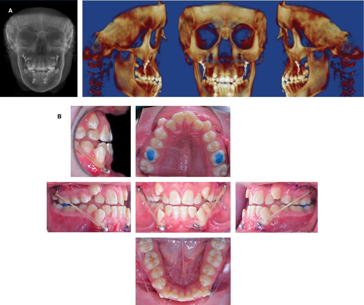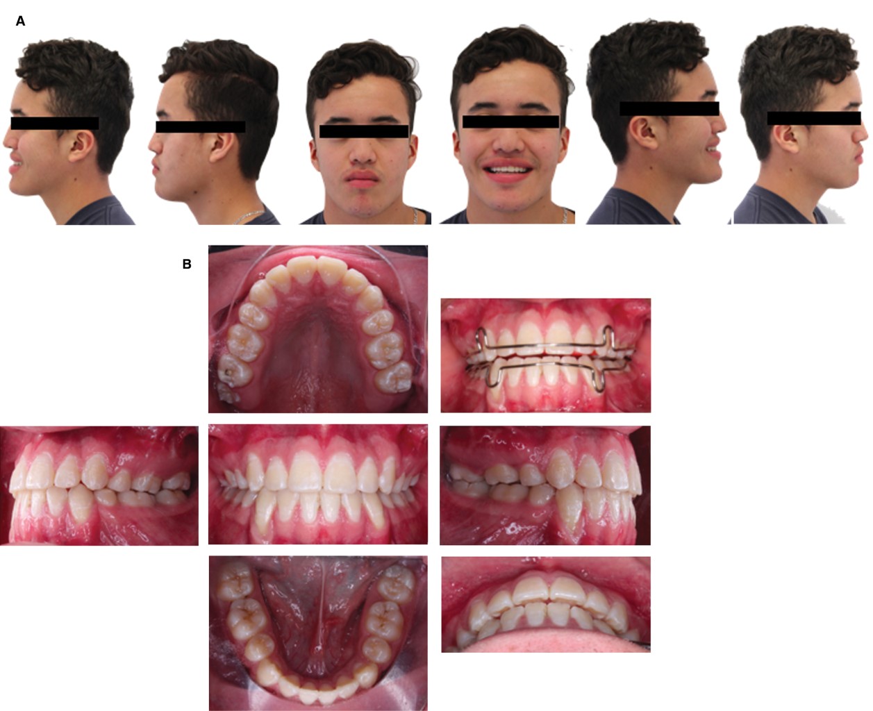 Durante la fase ortopédica se realizó la colocación de las placas de anclaje esqueletal de 2.0 mm de titanio, cada una con dos tornillos de 2.0 × 9 mm colocados en la parte mandibular entre caninos y laterales de ambos lados y en la parte maxilar en el arco cigomático a nivel radicular del segundo molar en ambos lados, el cual es un procedimiento realizado con anestesia general, pero ambulatorio. Al mes del procedimiento quirúrgico se toma una tomografía de haz cónico (Cone Beam) para la evaluación de la osteointegración de las placas y posteriormente hacer la colocación de elásticos clase III con 150 g de fuerza (Figura 4A), en esta fase del tratamiento se colocan turbo bite en primeros molares superiores para lograr la desoclusión anterior y que la mecánica fuera más efectiva junto con los elásticos clase III que se utilizaron por 10 meses (Figura 4B), comenzando con fuerzas ligeras desde los 150 g hasta llegar a los 450 g por lado. Posterior a esto, el paciente presentó una mejor relación maxilomandibular y se continuó con la fase ortodóncica para la corrección de la oclusión (Figura 5).