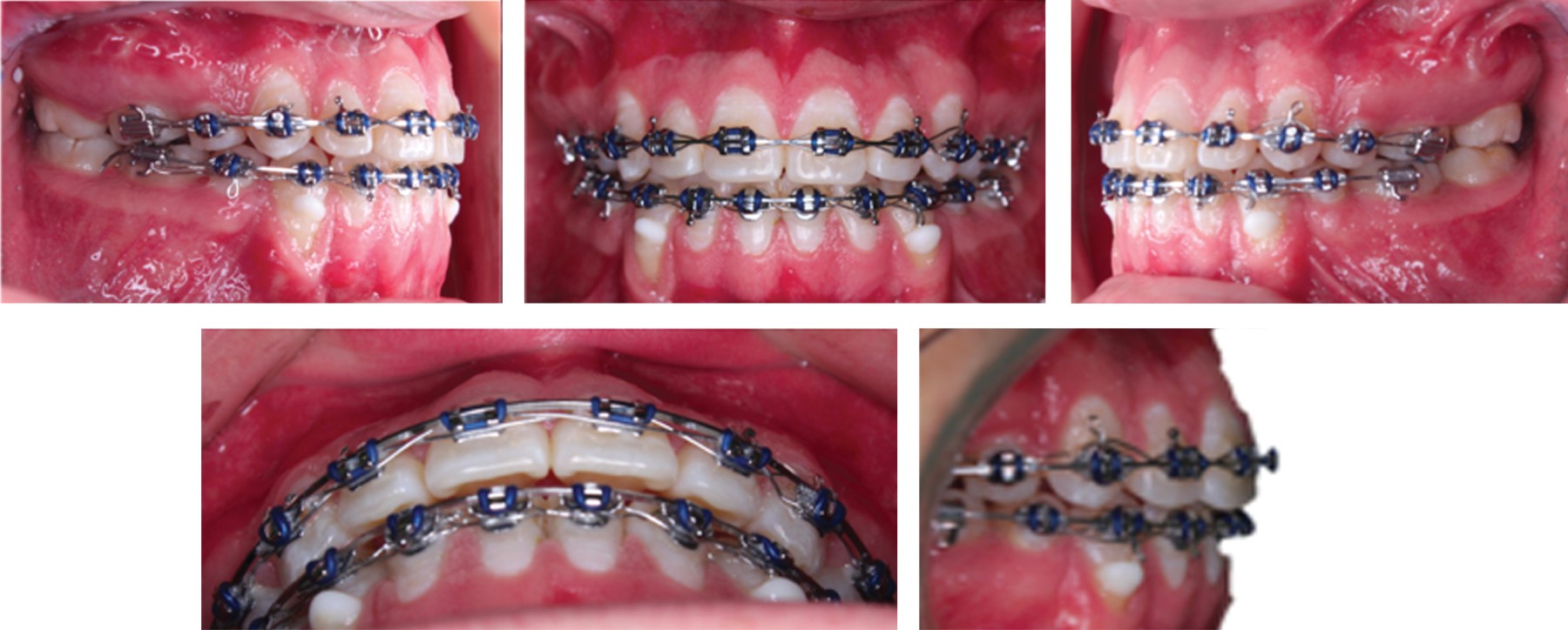 En la fase ortodóncica se planificaron las extracciones de los primeros premolares superiores e inferiores por las compensaciones dentarias y el apiñamiento presente. Se continúa con la cementación de brackets Alexander, bandas en primeros molares y tubos en segundos molares superiores e inferiores con slot 0.018". En cuanto a la alineación y nivelación, como se tiene un overjet positivo y se necesita mejorar el perfil, se procede con las extracciones para liberar el apiñamiento, con una secuencia de arcos de níquel titanio 0.012", 0.016" nitinol termoactivado, 0.016" × 0.022" nitinol termoactivado y 0.016 × 0.022 de acero superior e inferior en un periodo de 10 meses. En la fase de trabajo se utilizó 0.016 × 0.022 de acero, se cierran espacios con un loop doble delta en un periodo de siete meses. En el detallado se coloca un arco 0.016 de acero con stops cortos en la parte inferior, y en la finalización se termina con el uso de elásticos para asentamiento en arcos térmicos por un periodo de ocho meses. Para la retención final se indica un circunferencial superior e inferior con la indicación de uso de 24 horas.