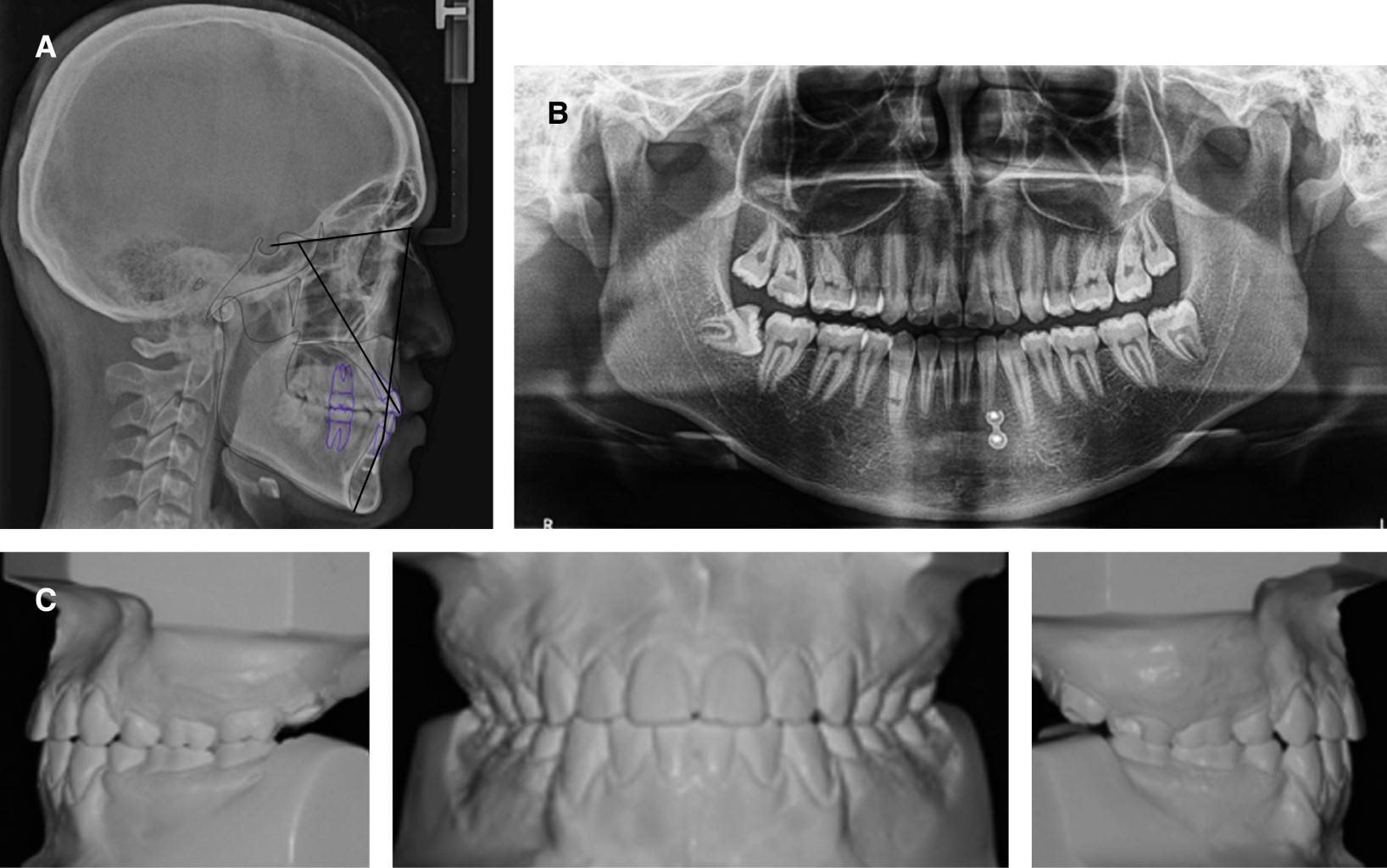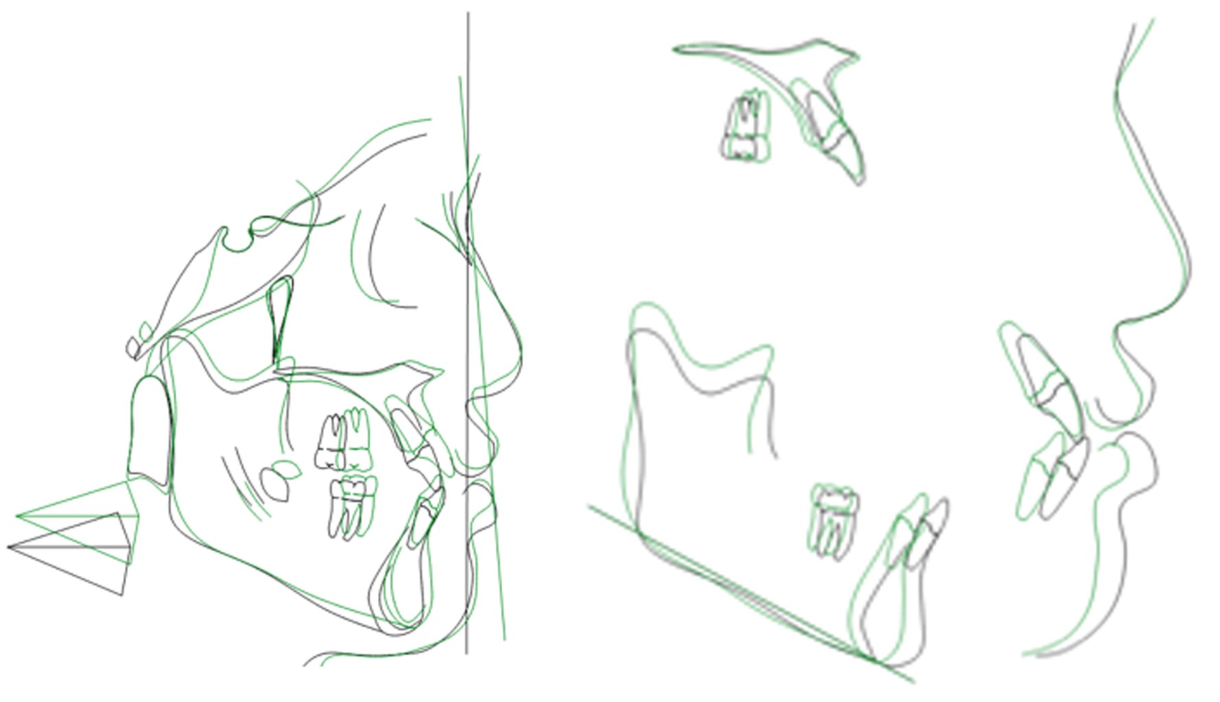 Se obtuvo una buena armonía facial y estética (Figura 6A), se consolidaron clase I molar y canina, se obtuvo un correcta sobremordida horizontal y vertical se finalizó el tratamiento con una forma de arco ovoide en ambas arcadas (Figura 6B). En la radiografía lateral de cráneo (Figura 7A), así como en la cefalometría de Steiner (Tabla 1) se logró clase I esquelética, normo-divergencia, adecuada guía anterior con la que finaliza el paciente, y los cambios positivos en el perfil. La radiografía panorámica final presentó un buen paralelismo radicular, 24 dientes presentes, con el OD 18 y 28 en proceso eruptivo, OD 38 retenido, OD 48 impactado. Por lo que se remite al paciente al Departamento de Cirugía Oral para la extracción de los terceros molares. Se observó la placa inferior izquierda entre OD 32 y 33, al momento del abordaje quirúrgico para retirarla se encontró osteointegrada, y puesto que su remoción implicaba la eliminación de una cantidad considerable de tejido óseo se decidió dejarla (Figura 7B). En los modelos de estudio se encuentra una línea media dental coincidente, un buen asentamiento posterior y una relación anteroposterior adecuada (Figura 7C). En la superimposición de los trazados cefalométricos se analiza el posicionamiento maxilar y mandibular determinando una adecuada corrección esqueletal lograda postratamiento en referencia con los puntos anatómicos estables en la etapa de maduración y una adecuada posición dental (Figura 8).
