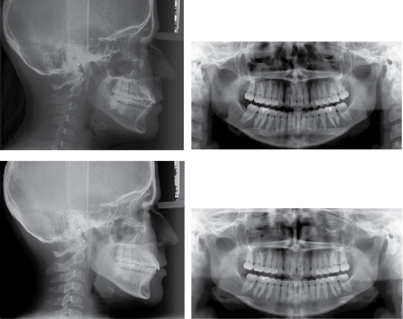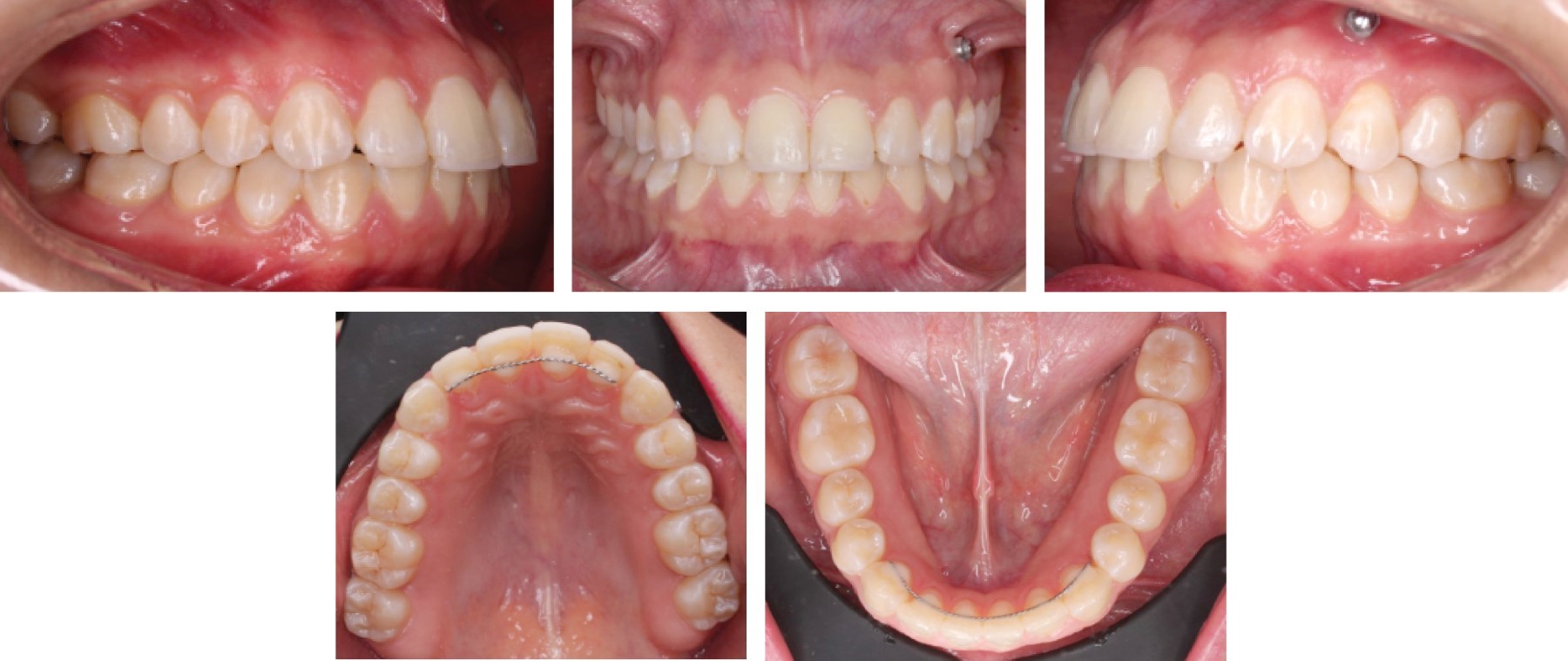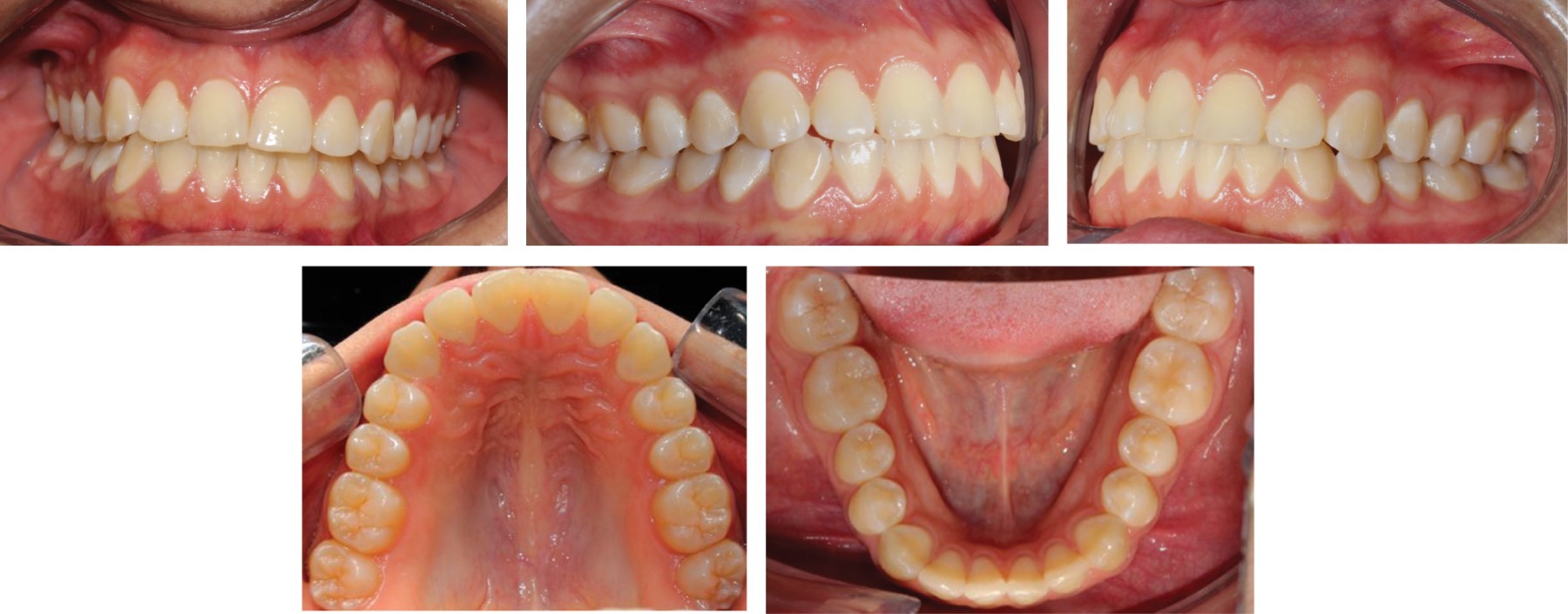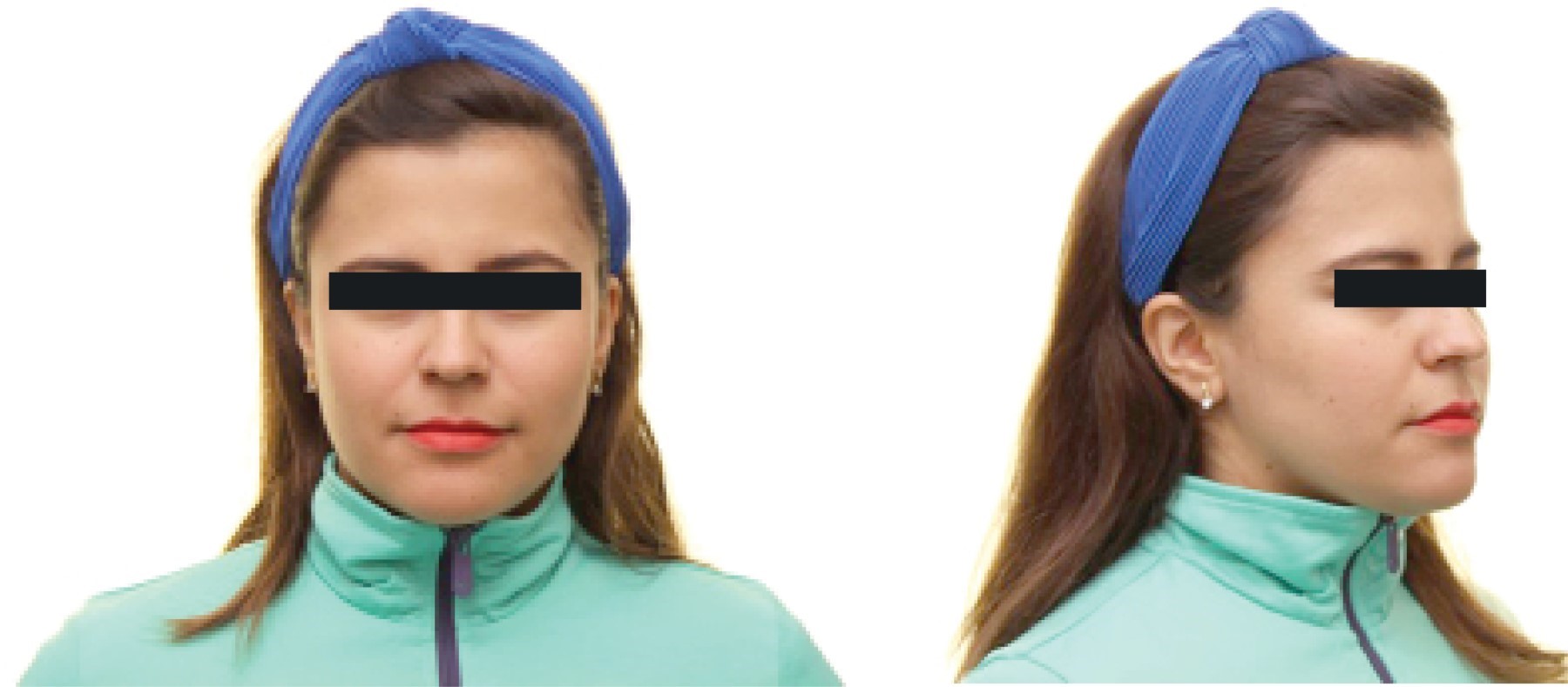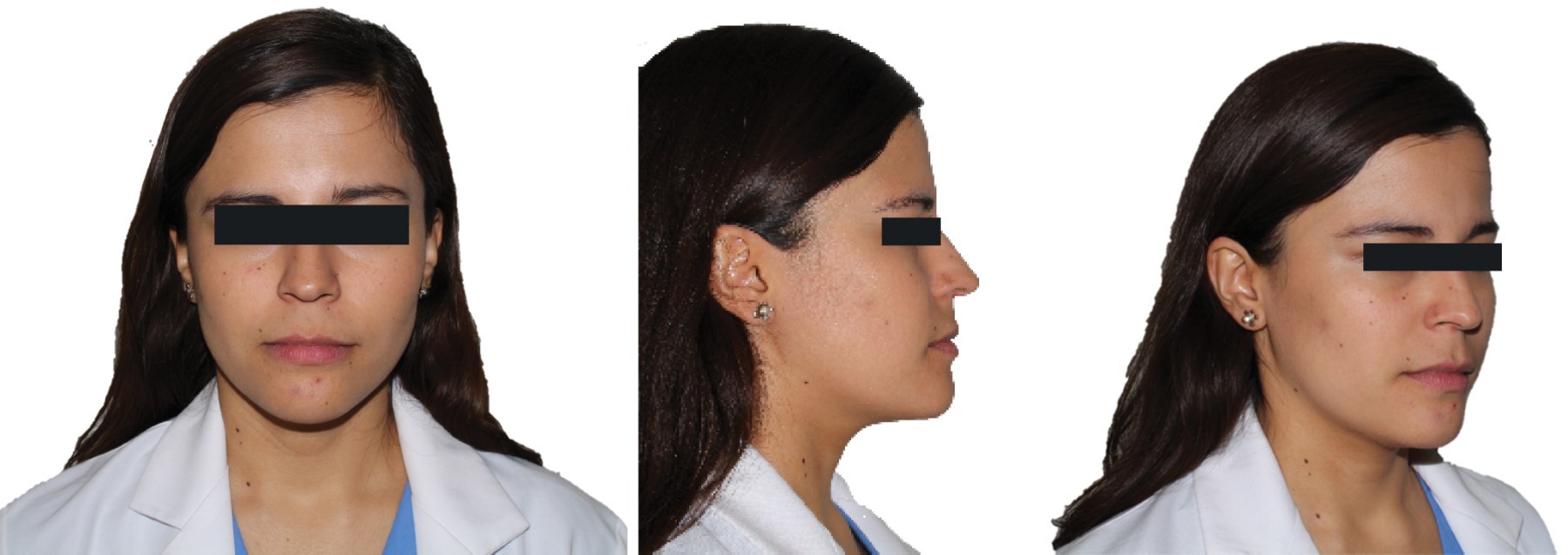 Paciente femenino de 24 años que acude a Clínica de Ortodoncia en la Escuela Nacional de Estudios Superiores Unidad León para corregir un canteamiento evidente. No presenta enfermedades crónicas ni datos patológicos que interfieran con el tratamiento. Diagnóstico: clase I esquelético biprotrusiva con crecimiento neutro, facialmente es una paciente braquifacial con perfil recto y retroquelia, se observó asimetría facial en la comparación del lado izquierdo y derecho. Incisivos superiores proinclinados, giroversiones, clase molar III derecha e izquierda, clase I canina bilateral, línea media desviada y plano maxilar canteado donde se observa que se necesita una intrusión de 5 mm para corregirlo (Figuras 1, 2 y 3).