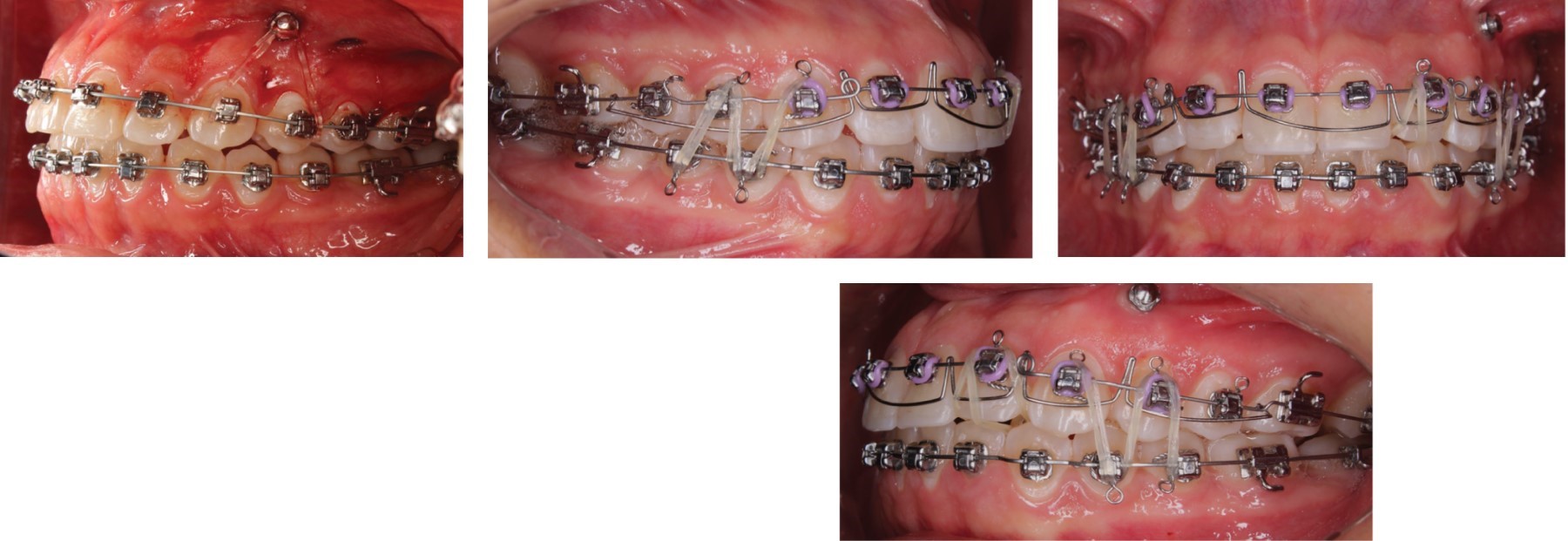 Fase 1: de arcos redondos de CuNiTi, superior e inferior 0.013" CuNiTi, seguido del 0.018" CuNiTi, elástico clase III lado izquierdo del OD 25 al 34 de 3/16 ligero.