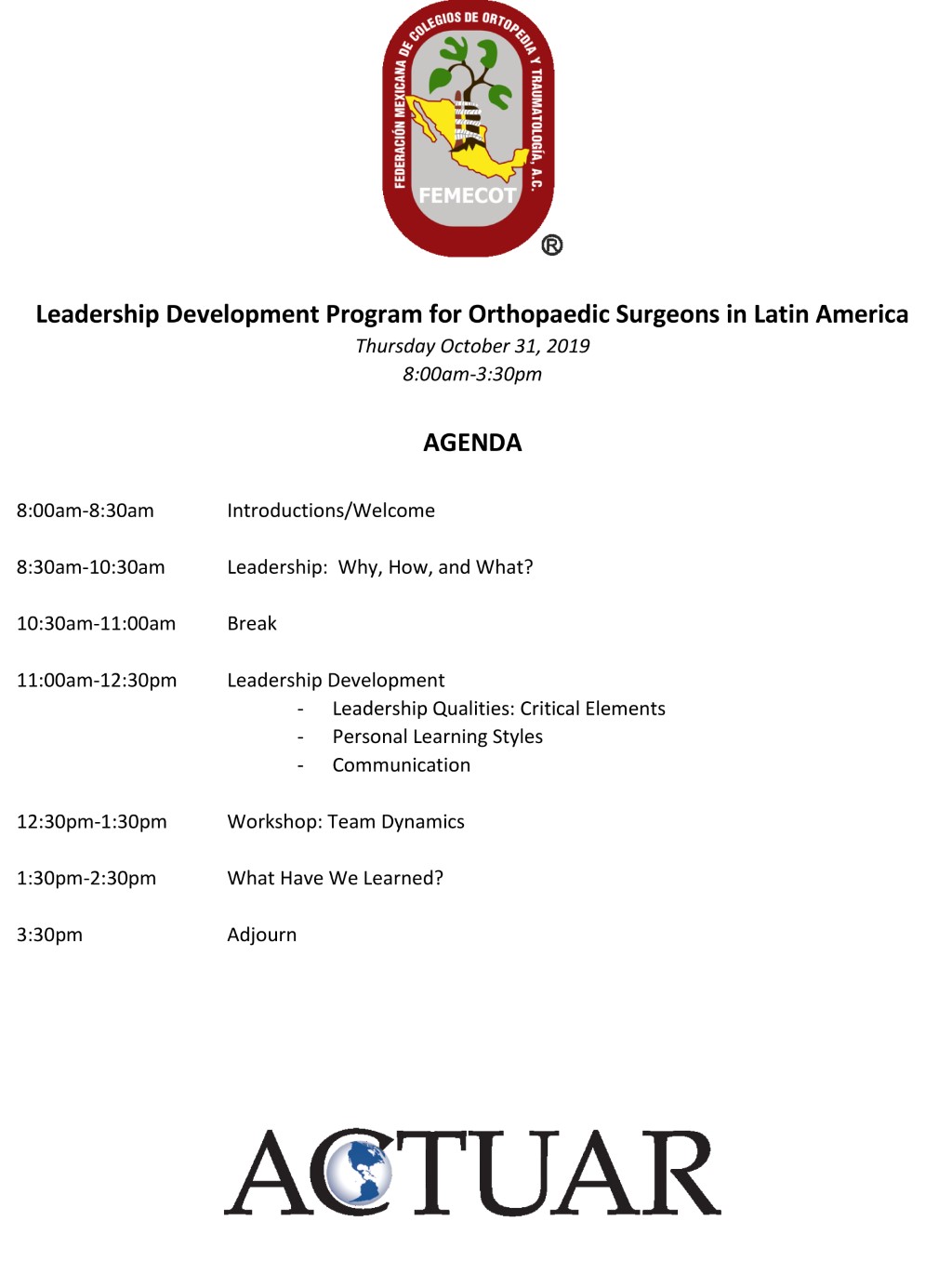 Como resultado, en 2019 los miembros de ACTUAR y los profesores de la Universidad de California, San Francisco (UCSF) y la Federación Mexicana de Colegios de Ortopedia y Traumatología, A.C. (FEMECOT) colaboraron en el diseño de un curso de liderazgo, desarrollado en un día, que se impartió en uno de los mayores congresos anuales de ortopedia en América Latina. Dada la relativa ausencia de modelos de programas de liderazgo para cirujanos ortopédicos, a los principales organizadores del curso se les encomendó la tarea de elaborar un plan de estudios adaptado a la cirugía ortopédica para que fuera pertinente y aplicable.