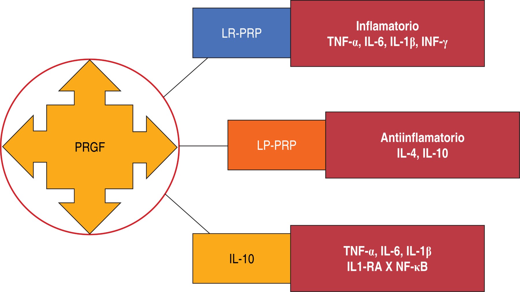 Efecto antiinflamatorio: suprime el factor nuclear potenciador de las cadenas ligeras kappa de las células B activadas, el cual tiene un papel importante en la respuesta inflamatoria, disminuye las citoquinas inflamatorias como la IL-6, IL-1β, TNF-α. Como antiinflamatorio aumenta la presencia de IL-4 y la IL-10 y esta última suprime el NF-κB por medio de la activación del receptor antagonista de la IL-1 (IL-1Ra).12 La Figura 1 muestra los elementos en los que actúa el plasma rico en factores de crecimiento (PRGF) durante el proceso de inflamación.12