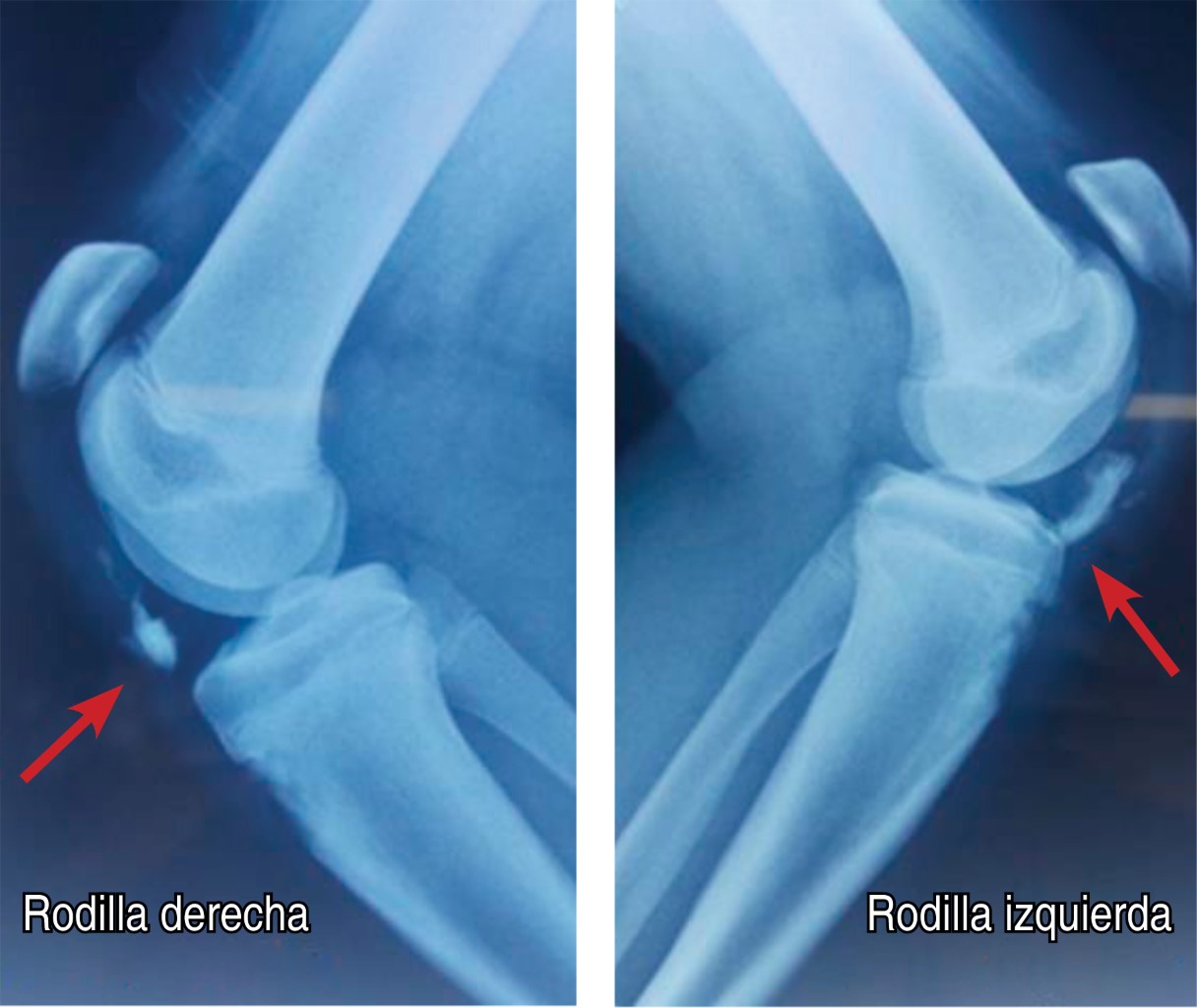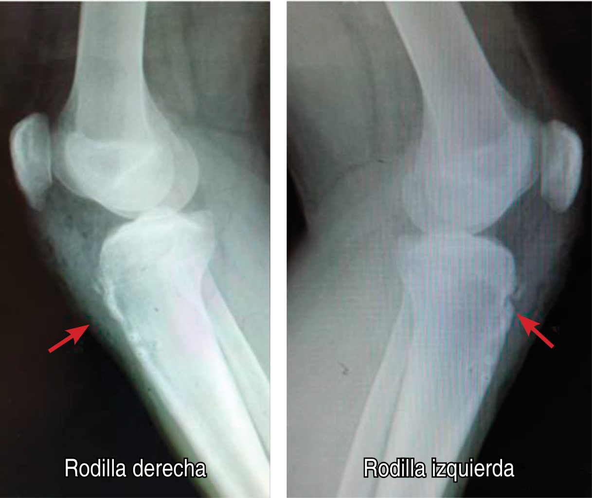 Masculino de 14 años, con antecedente de Osgood-Schlatter diagnosticado a los siete años, que inicia padecimiento al evitar caer de patineta, seguido de dolor intenso en ambas rodillas e imposibilidad a la bipedestación. A la exploración física con edema en rodillas, con actitud en flexión de 30o, imposibilidad a la extensión activa. A la palpación rótula alta y tuberosidad tibial desplazada en ambas rodillas.