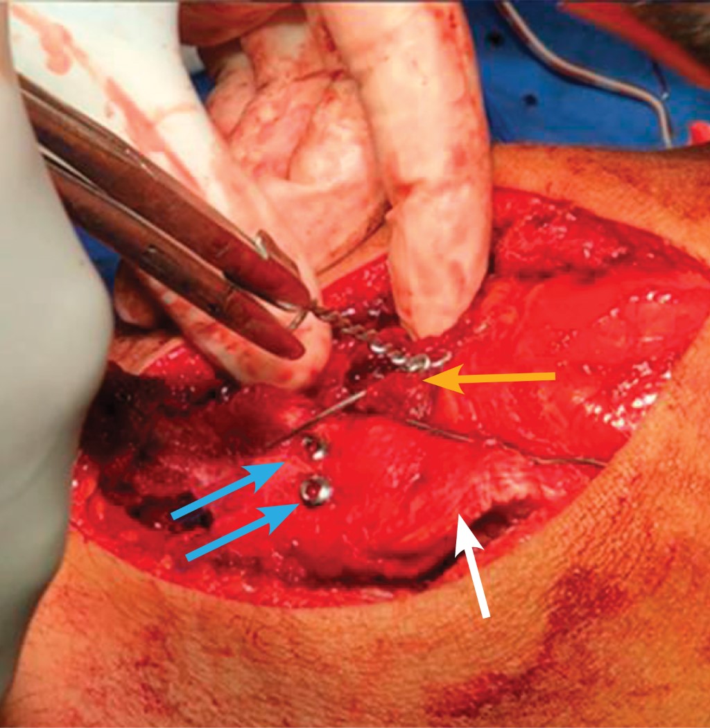 Biomecánicamente el tendón del cuádriceps tracciona la fractura de la tuberosidad tibial, las bandas de tensión pueden neutralizar estas fuerzas. Nikiforidis y colaboradores describen el procedimiento con alambre quirúrgico abrazando el polo superior de la rótula y después fijándolo a la tibia, por debajo de la tuberosidad tibial,18 así evitando el desplazamiento de la fractura al momento de la movilización temprana y con ello disminuyendo el riesgo de artrofibrosis y pérdida de masa muscular.5