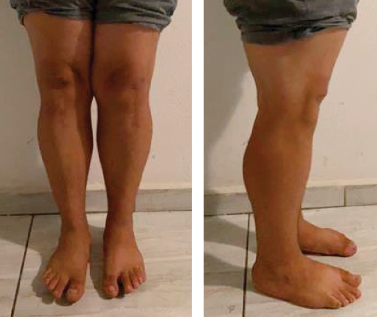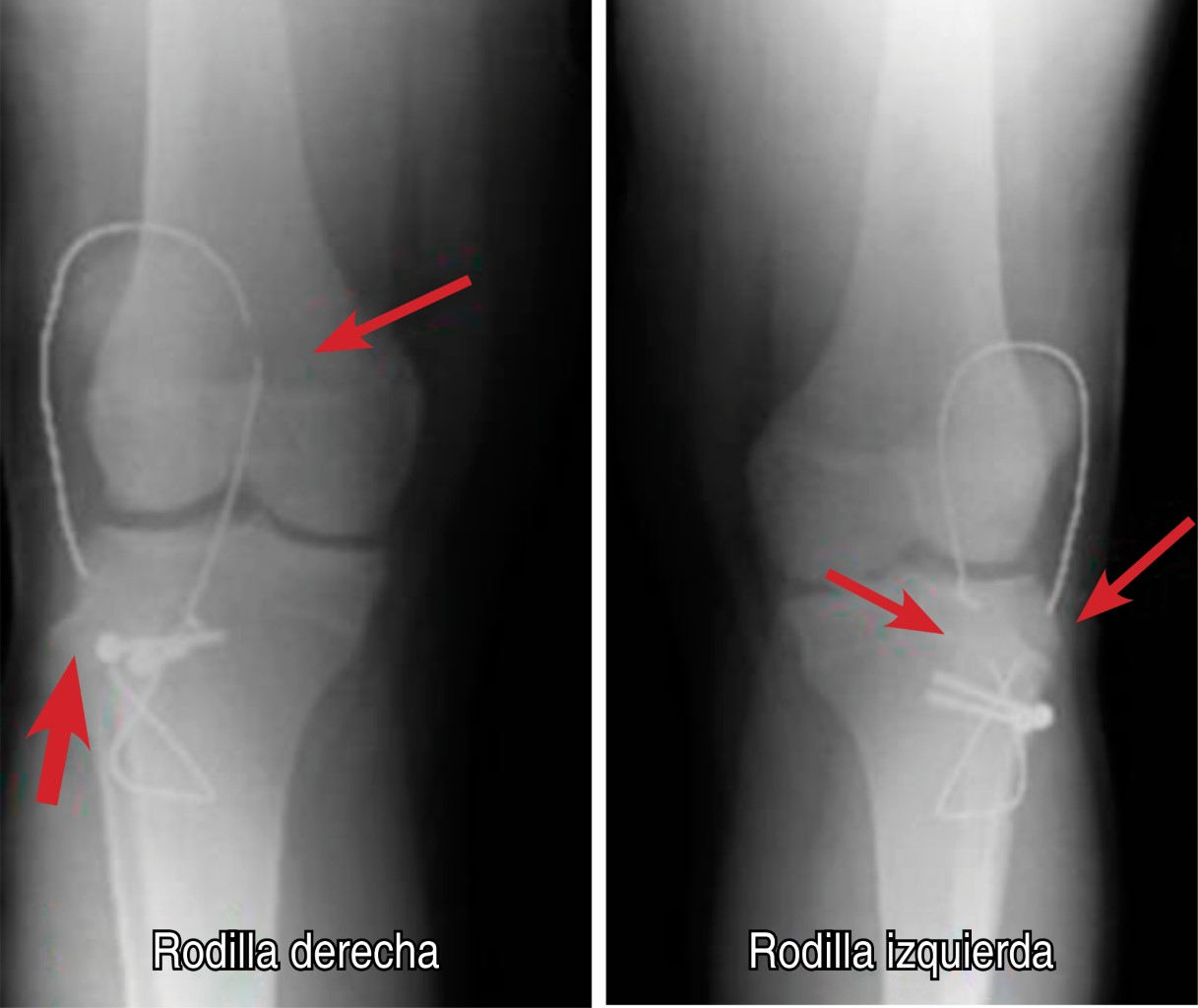 Se realiza intervención quirúrgica, encontrándose lesión de retináculo medial bilateral, tendón rotuliano íntegro, tuberosidades tibiales se fijan con dos tornillos de esponjosa 4.0, arandelas y bandas de tensión con alambre 1.2 mm a 45o de flexión (Figura 2). Movilización activa a 60o de flexión y 0o de extensión de rodillas en postquirúrgico inmediato. No es posible retirar bandas de tensión a la sexta semana, aun así el paciente ya contaba con arcos de movilidad completos y deambulación sin ayuda de muletas. Tres meses y medio postquirúrgico inicia con dolor repentino e imposibilidad a la deambulación, estudio radiográfico muestra fatiga de bandas de tensión y tuberosidades tibiales con datos de consolidación (Figura 3), por lo que se retira material de osteosíntesis. Al año de evolución se encuentran fracturas consolidadas (Figura 4), sin deformidad clínica en rodillas (Figura 5), sin dolor residual y realizando actividades deportivas.