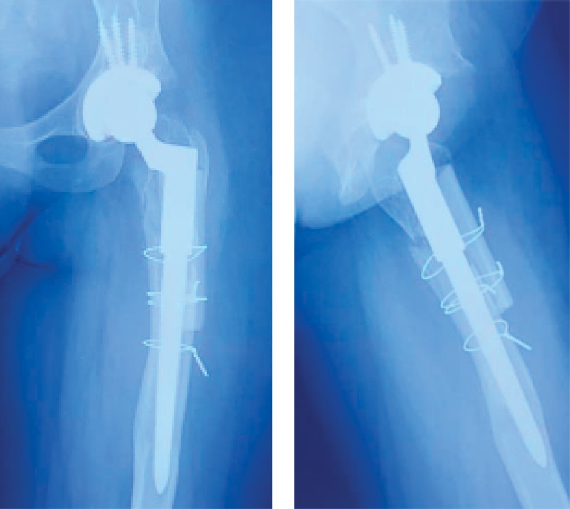 En lo que respecta al fémur, presenta un defecto proximal que se extiende a la diáfisis, el vástago indicado inicialmente no fue el correcto presentando hundimiento del mismo, ya que estos tipo de fémur presentan su anatomía irregular y son biomecánicamente insuficientes para una fijación metafisaria proximal, se decide retirar vástago realizando una osteotomía lateral femoral extendida, colocando un vástago modular cónico estriado, los cuales son los idóneos para este tipo defectos, ya que presentan una fijación diafisaria distal, donde al menos se requieren de 2 cm para que sean estables, otorgándoles estabilidad axial y rotacional.19 Se colocan tablas de aloinjerto diafisarias en defecto femoral proximal con la finalidad de proporcionar soporte estructural disminuyendo el índice de fracturas periprotésicas, así como la no unión de la osteotomía femoral extendida.20