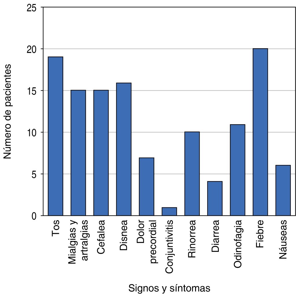 Dentro de los signos y síntomas se encontró que los principales corresponden a fiebre, tos y disnea que corresponden a las manifestaciones clínicas descritas a nivel internacional para el diagnóstico de COVID-19, seguidas de mialgias y artralgias y cefalea (Figura 2).3,5