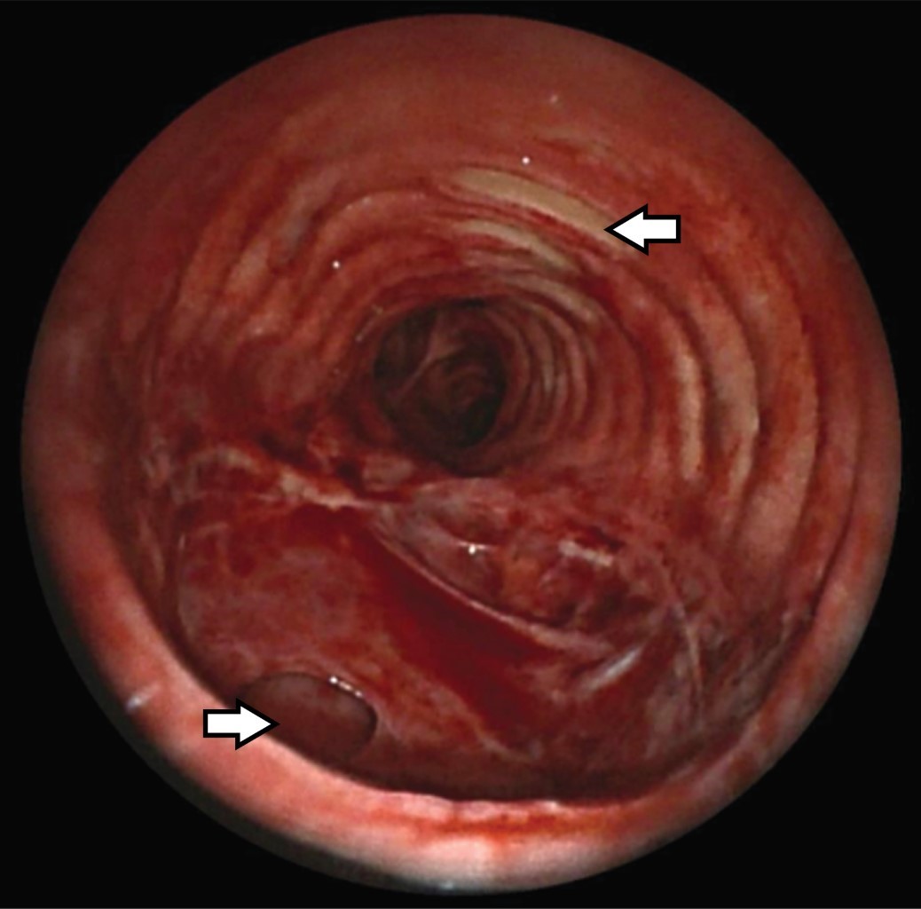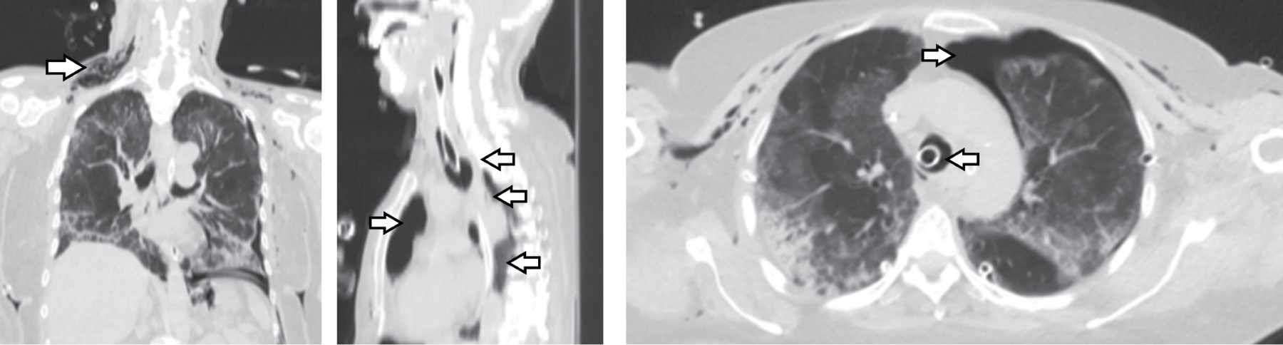 Femenino de 69 años. Ingresa a la Unidad de Terapia Intensiva (UTI) con diagnóstico de neumonía COVID-19, SDRA severo por Berlín con PaO2/FiO2 80 mmHg, pulsioximetría 92%, en ventilación mecánica invasiva (VMI) presión control 17 cmH2O, FiO2 60%, PEEP 12 cmH2O y frecuencia respiratoria 21/minuto. Al día 12 de VMI se realiza TP en la UTI con técnica de Ciaglia Blue Rhino.1 Se realiza incisión transversal de 2 cm a nivel del segundo anillo traqueal y punción entre el segundo y tercer anillo traqueal. A la aspiración se obtiene líquido citrino, por lo que se retira aguja y en una segunda punción se logra acceso efectivo. Se introduce cánula de traqueostomía de 8.5 mm y es conectada a la VMI; al momento presenta broncoespasmo tratado con broncodilatador y se realiza cambio de dispositivo a bolsa válvula mascarilla con reservorio; presenta resistencia a la ventilación con evidencia de enfisema subcutáneo masivo en tórax e hipoxemia por neumotórax a tensión bilateral; evoluciona a bradicardia y finalmente asistolia, se inician maniobras de reanimación, se realiza descompresión bilateral con aguja Punzocat no. 14, se asegura vía aérea con cánula orotraqueal de 8.5 mm al primer intento. Se logra retorno a la circulación espontánea con taquicardia sinusal e hipotensión, se colocan sondas endopleurales bilaterales y se procede a realizar fasciotomías pectorales para drenaje de enfisema subcutáneo; se observa en cámara de succión de Pleur-Evac® fuga aérea bilateral. Se recupera estabilidad hemodinámica a las 4 horas del evento y se realiza tomografía de tórax (Figura 1). La broncoscopia muestra laceración posterior de la tráquea (Figura 2). Por endoscopia se descarta lesión esofágica. El tratamiento inicial es conservador mediante ferulización traqueal durante 15 días. La broncoscopia de control muestra limitación de la perforación y tejido epitelizado; se decide cierre de lesión traqueal con parche de músculo esternohioideo izquierdo, se verifica aerostasia sin observar fuga (Figura 3). Se realiza traqueostomía a nivel de segundo y tercer anillo traqueal, y se coloca cánula de 7 mm Bivona® (Smiths Medical, Minnesota, EEUU), la rama distal queda pasando la perforación, se verifica aerostasia y hemostasia, se coloca drenaje Jackson Pratt® 10 mm (Bard, Covington GA USA) a lecho quirúrgico, con evolución radiográfica que demuestra expansión pulmonar, sin enfisema subcutáneo ni neumomediastino (Figura 4). Al quinto día del procedimiento quirúrgico cursó con broncoespasmo severo y obstrucción traqueal, presenta parada cardiaca sin lograr retorno espontáneo de la circulación.