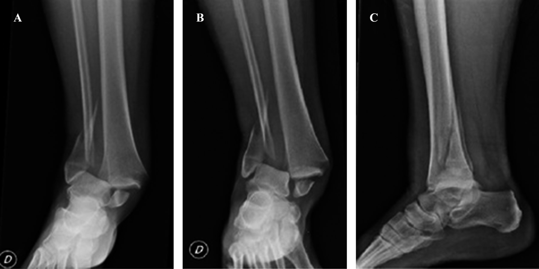 Al examen físico presenta impotencia funcional de tobillo derecho que impide la marcha. Se observa deformidad ósea e importante edema de partes blandas. Buen relleno capilar, pulsos periféricos positivos, movilidad limitada y sensibilidad con parestesias. Se decide realizar estudio radiográfico de tobillo derecho evidenciándose luxofractura del mismo (Figura 1), que correspondería a una 44-B3 dentro de la clasificación AO. A continuación, se procede a la reducción cerrada, inmovilización con valva corta de yeso en miembro inferior y posterior radiografía de control de la reducción (Figura 2). Se decide tratamiento quirúrgico programado cuatro días después, por lo que se indica tratamiento anticoagulante con enoxaparina 40 mg y suspensión del mismo un día previo a la cirugía.