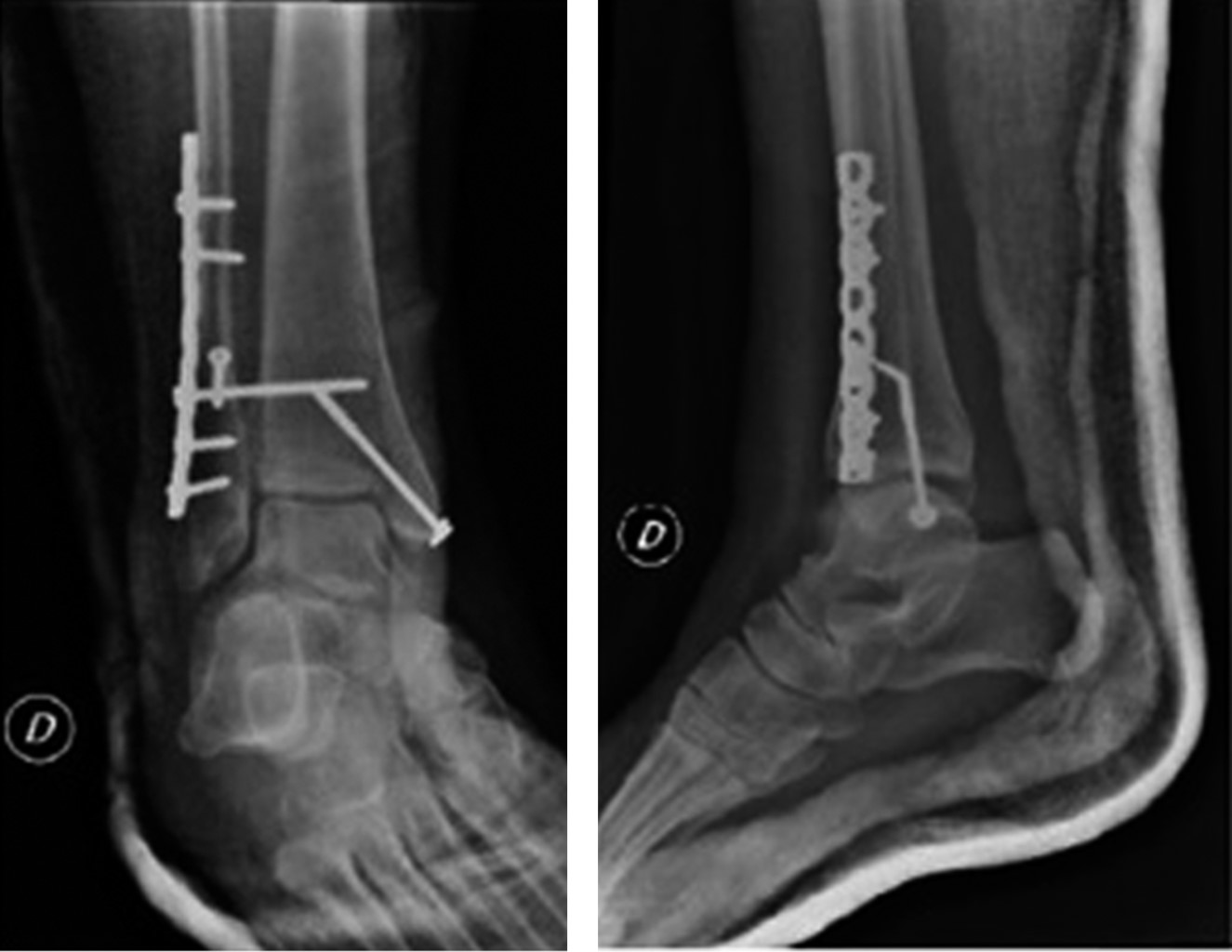 Después se realizó procedimiento quirúrgico con reducción y osteosíntesis de maléolo lateral con tornillo interfragmentario y placa de reconstrucción de huesos planos de ocho orificios; maléolo medial con tornillo rosca parcial con arandela; reducción de sindesmosis y colocación de tornillo transindesmal a través de placa. Inmovilización con férula de yeso. Paciente tolera la cirugía sin complicaciones con alta sanatorial al día siguiente.