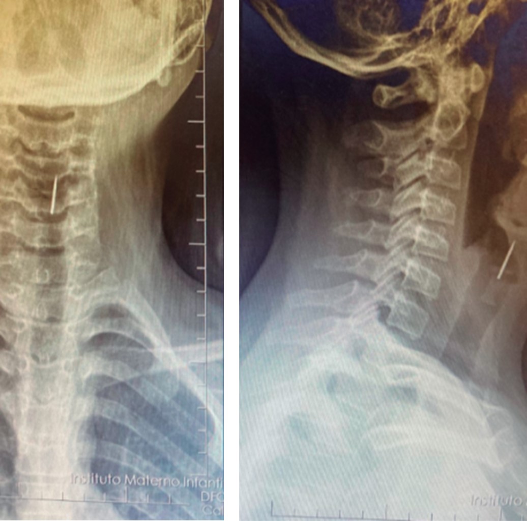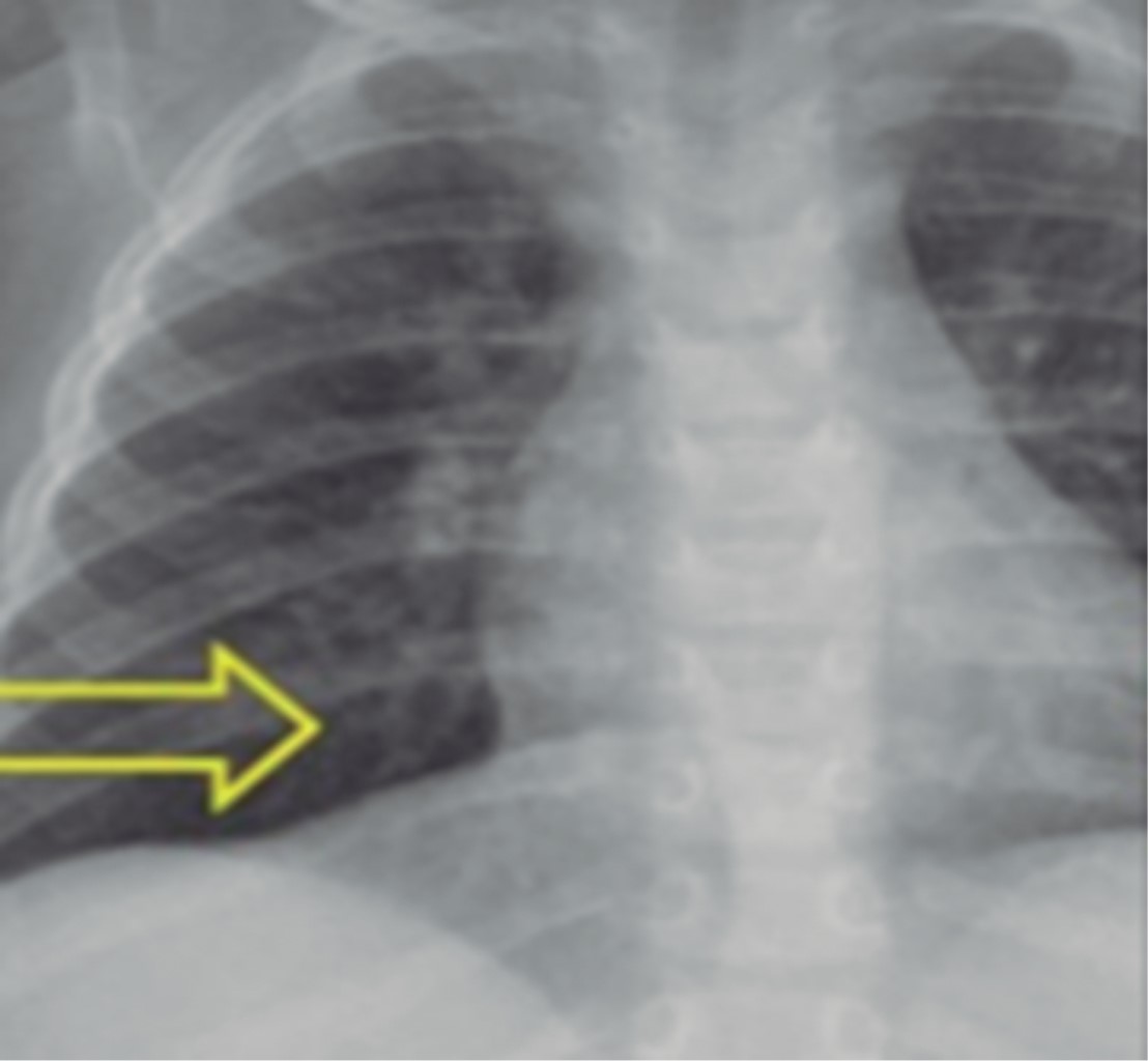 La radiografía de tórax es un estudio de bajo costo que debe realizarse ante la sospecha de aspiración de cuerpo extraño. La radiografía de tórax normal no excluye la presencia de un cuerpo extraño en la vía aérea. Se ha reportado 30-50% de radiografías normales de pacientes con cuerpo extraño alojados en los bronquios.9 Otras series reportan 18% de radiografías normales y 48% con hallazgos inespecíficos como hiperinsuflación o atrapamiento de aire, atelectasia, infiltrados o engrosamiento de la pared bronquial (Figuras 1, 2, 3 y 4).10