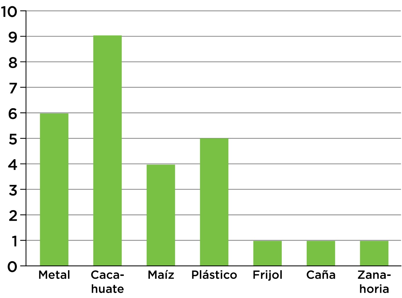 De los 43 pacientes sometidos a broncoscopia por sospecha de cuerpo extraño, se encontró cuerpo extraño en 27 niños, de los cuales 19 fueron hombres y ocho mujeres con edades entre nueve meses y 12 años con un promedio de tres años con seis meses. La duración de la retención de cuerpo extraño en vía aérea varió de 30 minutos a tres meses con un promedio de seis días, mediana de 24 horas. Los síntomas iniciales fueron tos en 13 pacientes, disnea en seis, cianosis en cinco, desvanecimiento en uno, sialorrea en uno, y un asintomático; los signos y síntomas a la llegada al hospital fueron disnea en ocho pacientes, sibilancias en siete, tos en cuatro, estridor en cuatro, desvanecimiento en dos, sialorrea en uno y un asintomático. Los alimentos fueron el tipo de cuerpo extraño más común (Figura 6), 41% de los pacientes no tuvieron signos radiológicos, 59% sí los tuvo: hiperinsuflación en cinco, cuerpo extraño radiopaco en cinco, atelectasia en tres, engrosamiento de pared bronquial en tres; el bronquio principal derecho fue el sitio anatómico donde más comúnmente se encontró el cuerpo extraño con 15 pacientes, cinco en bronquio principal izquierdo, cuatro en tráquea, uno en cuerdas vocales, uno en laringe y uno en narina.
