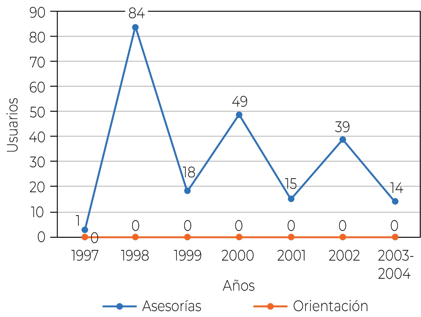 - a. Asesorías: éstas observan un incremento en 1998, y 2007, con un posterior descenso 2008-2009, ascendiendo a un 18% en el 2020.