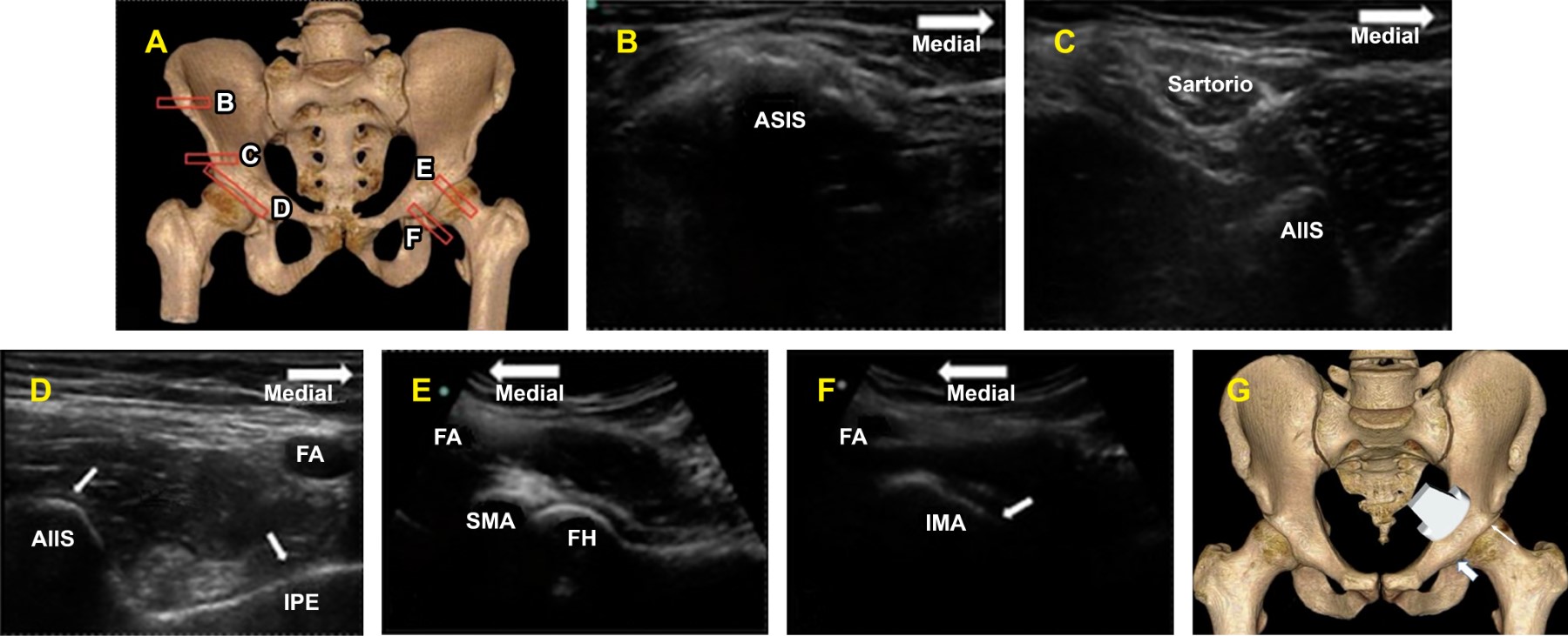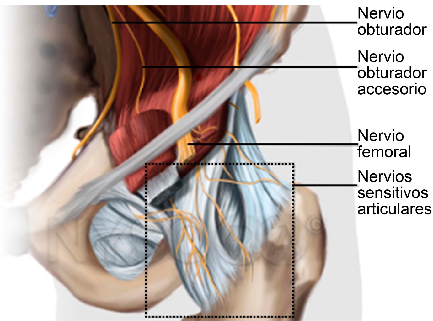 En este contexto, las técnicas anestésicas multimodales de mínima invasión con esquemas optimizados para la disminución del consumo de opioides y sus efectos adversos cobran relevancia.5 Una técnica emergente propuesta es el bloqueo del grupo de nervios pericapsulares de la cadera (Pericapsular Nerve Group, PENG por sus siglas en inglés), descrito a finales de 2018 por los Doctores Girón-Arango y Peng6 basados en el estudio anatómico del Dr. Short, en el que se demostró que los nervios femoral, obturador y obturador accesorio juegan un papel predominante en la inervación de la articulación de la cadera (Figura 1), y que identificó las referencias anatómicas que facilitan el abordaje ecoguiado (Figura 2).7