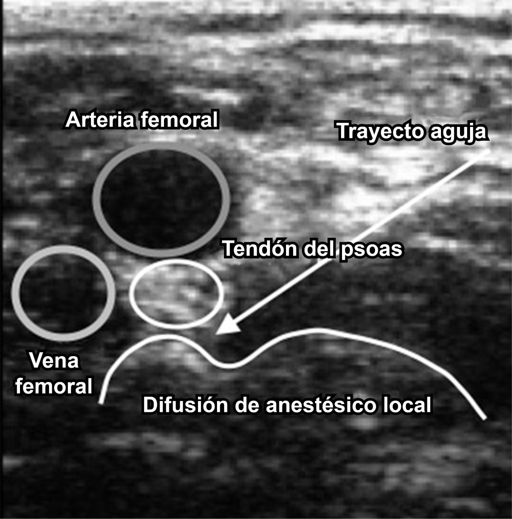 Técnica anestésica: en sala quirúrgica bajo monitoreo estándar II de la ASA, con oxígeno suplementario por puntas nasales a 2 L/min en decúbito supino, se realizó asepsia de la región ilioinguinal ipsilateral a la fractura con clorhexidina 2%, se utilizó un transductor lineal de alta frecuencia con protección estéril y gel de interfaz colocándose en plano transverso sobre la espina iliaca anteroinferior, se realizó rotación medial a 45o aproximadamente hasta localizar la eminencia iliopúbica. Las estructuras a identificar son la arteria y vena femorales, los nervios femoral, obturador y obturador accesorio y el tendón del músculo psoas (Figura 3). Se utilizó una aguja Stimuplex de 22 G de 100 mm ecogénica. Con técnica in plane, se depositaron 30 mL de ropivacaína 0.5%, verificando su difusión en el plano musculofascial entre el tendón y la rama púbica. Quince minutos después, se colocó al paciente en decúbito lateral sobre el lado contrario a la fractura, se procedió al bloqueo neuroaxial con técnica subaracnoidea dosis única con aguja Whitacre 27 G ministrando 10 mg de bupivacaína isobárica. Durante el transanestésico, sólo se agregó paracetamol de 1 g y parecoxib de 40 mg como medicación analgésica y se continuó con horario. En caso de requerir analgesia adicional durante el periodo de evaluación, se utilizó tramadol 50 mg como rescate.