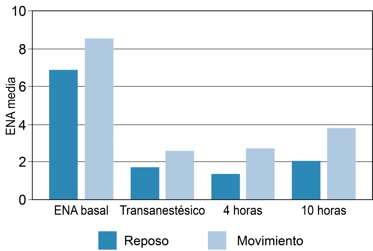 Los pacientes incluidos es este estudio fueron 14, de los cuales nueve (64%) son mujeres y cinco (36%) hombres, con una edad mínima de 42 años y edad máxima de 95 años, edad media de 72.78, la valoración de ASA fue I en dos pacientes, II en nueve pacientes, III en tres pacientes, la extremidad afectada izquierda se presentó en 57%, y derecha en 43%, siendo la cirugía más frecuente la reducción abierta y fijación interna (RAFI), en la evaluación de dolor con la escala de evaluación numérica análoga se obtuvieron las siguientes medias, la realizada previa al bloqueo (basal), en reposo se obtuvo una media de 6.9 y en movimiento 8.6, durante el transanestésico en reposo se obtuvo 1.7 y en movimiento 2.6, la evaluación a las cuatro horas posteriores en reposo fue de 1.3 y en movimiento 2.7 y a las 10 horas en reposo 2 y en movimiento 3.8, la medicación analgésica fue continuada con horario y no se requirieron rescates de opioides (Figura 4).