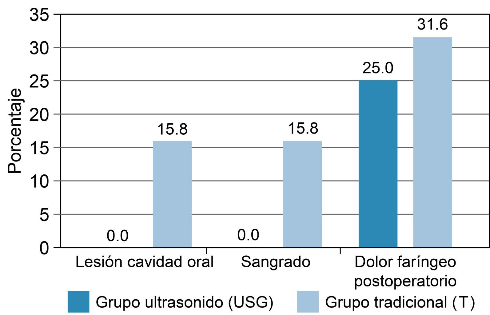 Al comparar la frecuencia de lesiones de la cavidad oral entre pacientes que tuvieron y no valoración de la vía aérea por ultrasonido durante la consulta preanestésica, se observó una frecuencia de lesiones de la cavidad oral de 15.8% en el grupo T (n = 3) y de 0% en el grupo USG (p = 0.096). En los tres casos en que hubo lesiones de la cavidad oral en el grupo T hubo sangrado (Figura 1). Presentaron dolor faríngeo postoperatorio 25% de los pacientes del grupo USG y 31.6% de los pacientes del grupo T (p = 0.723).